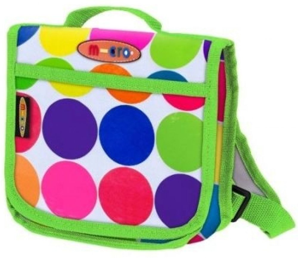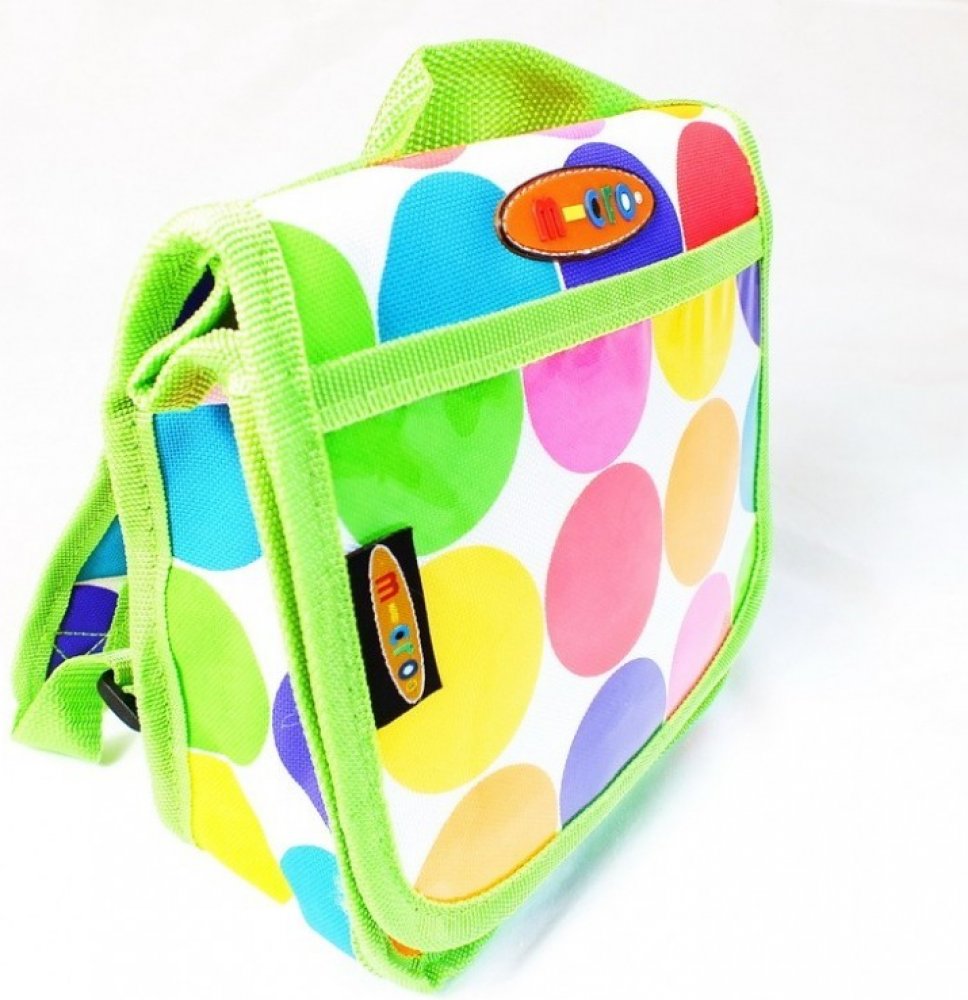 Batoh Micro Neon Dot je univerzální dětský batůžek v zelené barvě s tečkami, který je možné zavěsit na řídítka koloběžky nebo trojkolky Micro.
