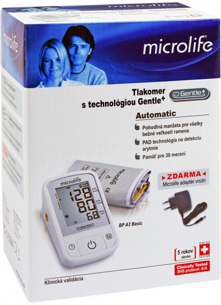 Microlife Tlakoměr BP A2 Basic je plně automatický, má paměť pro 30 měření, PAD technologii na detekci arytmie a indikátor pohybu paže. Mezi jeho další funkce patří indikátor chybné manžety, datum a čas a barevná indikace naměřených hodnot. Má pohodlnou manžetu ve velikosti M - L. Přístroj byl klinicky testován.
