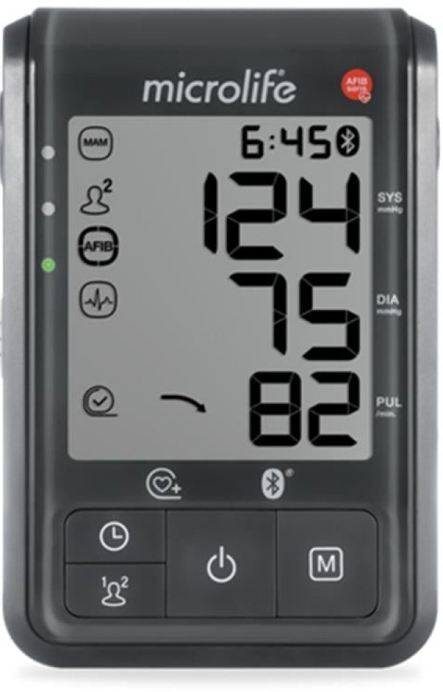 BP B6 Connect je špičkový měřič krevního tlaku pro vaše zdraví. Tento sofistikovaný výrobek nabízí více než cokoli jiného: s vysokou přesností detekuje fibrilaci síní (atriální fibrilaci) a po každém měření zobrazí šipku porovnávající hodnotu aktuálního měření s průměrem předchozích měření krevního tlaku. Pro ty, kteří chtějí o svém krevním tlaku vědět více, je tlakoměr BP B6 Connect přesně tou správnou volbou: všechny výsledky měření lze komplexně analyzovat pomocí aplikace Microlife Connected Health+ v chytrém telefonu nebo v počítači se softwarem BP Analyzer.Co je to fibrilace síní? Fibrilace síní (atriální fibrilace) je nejčastější srdeční arytmií a hlavním rizikovým faktorem mrtvice. Pravidelné domácí měření krevního tlaku pomocí tlakoměrů Microlife vybavených technologií AFIBsens se doporučuje k výraznému snížení rizika mrtvice nebo srdečního infarktu.Technologie AFIBsens pro detekci rizika mrtvice Spolehlivě detekuje fibrilaci síní (AFIB) vyskytující se při měření krevního tlaku v domácím prostředí. AFIBsens je prvním krokem v prevenci mrtvice.Technologie MAM (Microlife Average Mode) Automatická 3 měření na 1 stisknutí tlačítka a průměrný výsledek po analýze pro vysokou jistotu. MAM představuje spolehlivou diagnostiku hypertenze a kontrolu léčby.Technologie PAD Detekce pulzní arytmie (PAD) pro včasné varování před možnou srdeční arytmií.Software pro PC a aplikace pro chytré telefony "Microlife Connected Health+" je užitečná aplikace pro chytré telefony pro snadné sledování krevního tlaku a také dalších hodnot, jako je tělesná teplota nebo hmotnost. Po připojení přístroje BP B6 pomocí kabelu USB k počítači lze naměřené údaje vyhodnocovat pomocí softwaru "BP Analyzer".Klinická validace Přístroj byl klinicky validován z hlediska přesnosti podle protokolu Britské a irské společnosti pro hypertenzi a je hodnocen stupněm A/A. Zdravotnický přístroj je rovněž doporučen pro měření krevního tlaku u dětí (od 12 let), diabetiků, osob s onemocněním ledvin, obezitou a v těhotenství při preeklampsii.Tvarovaná pevná manžeta M-L Ramenní manžeta je kónicky tvarovaná a pevná pro snadné nasazení a nejvyšší úroveň pohodlí. Velikost M-L (22-42 cm) je vhodná pro všechny běžné velikosti ramen.Paměť pro 99 výsledků měření pro každého ze 2 uživatelů a zobrazení průměru všech uložených údajů a průměru měření s optimálně nasazenou manžetou za předchozích 28 dní.MyCheck Zobrazení porovnání naměřené hodnoty krevního tlaku s průměrem měření pomocí jednoduché šipky.MyBP Průměr 12 klinicky relevantních měření za předchozích 28 dní, provedených ráno (05:00 -10:59) a večer (17:00 - 22:59).Mezinárodní směrnice pro hypertenzi doporučují používat klinicky validované přístroje a provádět 6-7 po sobě jdoucích dnů pravidelná měření ráno a večer. Aby společnost Microlife umožnila svým uživatelům dodržovat nejnovější doporučení, zavádí funkci "MyBP". Časový rámec měření byl prodloužen ze 7 na 28 dní, aby se usnadnilo provádění dostatečného počtu klinicky relevantních měření.Tříbarevný indikátor výsledků Přehledná indikace naměřených hodnot krevního tlaku pomocí barevné stupnice.Stručný popis funkcí - Plně automatický měřič krevního tlaku s měřením na paži - Mimořádně velký displej - AFIBsens - MAM - PAD - Technologie Gentle+ - Tříbarevný světelný indikátor pro vyhodnocení výsledků - Paměť pro 99 výsledků měření a průměr všech měření pro každého ze 2 uživatelů - Indikátor šipky průměru MyCheck - Průměr měření za předchozích 28 dní - MyBP - průměr klinicky relevantních měření - Indikátor správného nasazení manžety - Indikátor pohybu paže během měření - Nastavení data a času - Indikátor slabé baterie - Možnost dobíjení baterie Automatický měřič krevního tlaku Microlife BP B6 Afib s funkcí detekce arytmie je spolehlivým pomocníkem pro sledování vaší kardiovaskulární zdravotní situace. Jeho precizní technologie umožňuje přesné a rychlé měření, zajišťující spolehlivé výsledky. Monitor BP B6 Afib je navržen s ohledem na jednoduchost použití a pohodlí pacienta. S tímto zařízením můžete snadno monitorovat vaše hodnoty krevního tlaku a arytmie v pohodlí vašeho domova. S investicí do tohoto moderního monitoru krevního tlaku značky Microlife získáte důležitý nástroj pro péči o vaše zdraví.