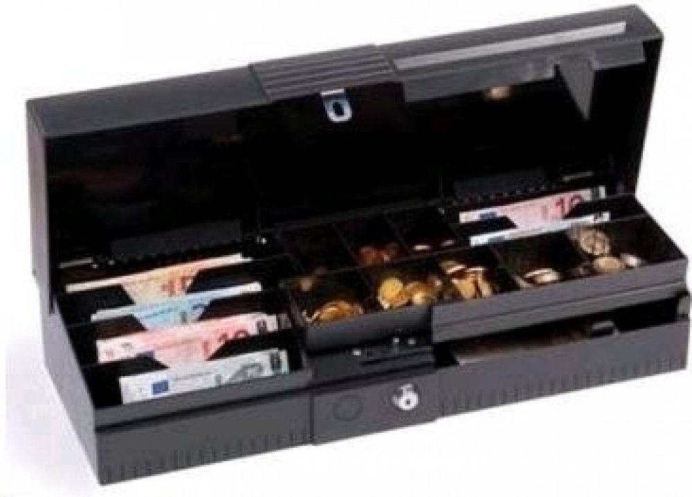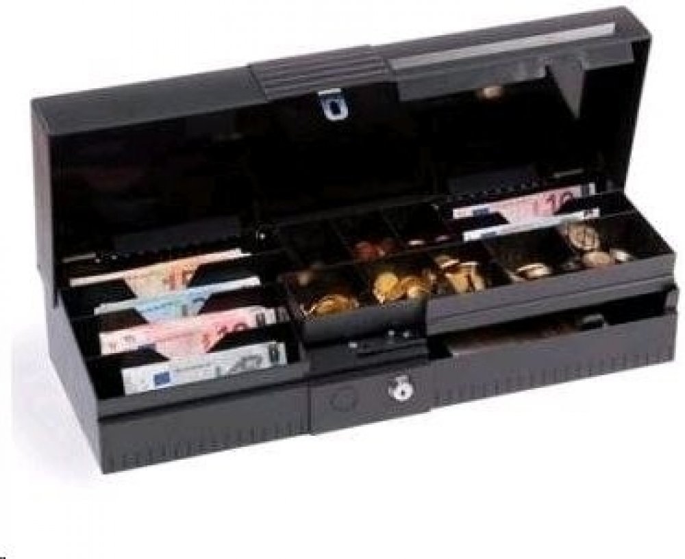 6 přihrádek pro bankovky 8 přihrádek na mince 1 přihrádka pro doklady