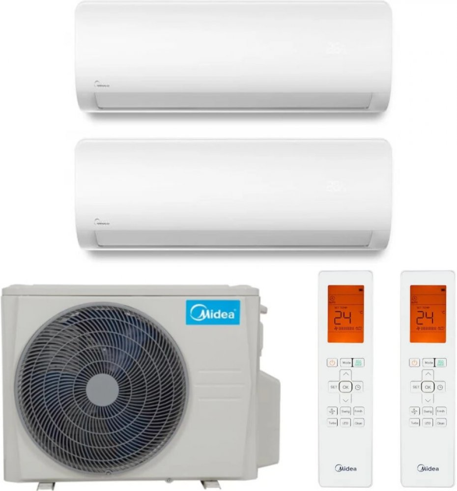 Midea Xtreme Save Pro multisplit 2x1 (2,6+3,5 kW) včetně montáže Nástěnná klimatizace určená pro chlazení i vytápění. Venkovní jednotka M2OE-18HFN8-Q a dvě vnitřní jednotky Xtreme Save Pro 1x 2,6 kW (MSAGBU-09HRFN8) a 1x 3,6 kW (MSAGBU-12HRFN8). Vnitřní jednotky jsou vhodné pro pokoje max. do 60-80 m3 (2,6 kW) a 100-110 m3 (3,5 kW). Cena standardní montáže obsahuje: 1ks venkovní a 2ks vnitřních klimatizačních jednotek, 2ks dálkového IR ovladače standardní montáž klimatizace do max. výšky umístění 3 m s váhou venkovní jednotky max. 35 kg; montáž těžší jednotky, na šikmé střeše nebo ve výšce nad 3 m je účtována s příplatkem za lešení/výškové práce; v případě zajištění lešení ze strany zákazníka, příplatek za něj neúčtujeme do 6 m propojovacího Cu potrubí 6/10 mm nebo 6/12 mm s izolací, komunikačních kabelů a hadice kondenzátu dva průrazy zdí (vyjma kamene, který je za příplatek) napojení na připravený přívodní kabel nebo do nejbližší zásuvky (bez zalištování) uvedení do provozu, DPH (pro fyzickou osobu - v případě fakturace na IČ se sazba DPH liší) ** ** V případě fakturace na IČ platí sazba 21% DPH pro neplátce DPH a přenesená daňová povinnost pro plátce DPH. Pro fyzickou nepodnikající osobu platí sazba 12% DPH. Cena neobsahuje: V ceně není započítaná konzole pro venkovní jednotku, krycí lišty, propojovací vedení navíc, čerpadlo kondenzátu, doprava, drážkování, lešení nebo výškové práce. V případě nutnosti plošiny je její zajištění na klientovi. Součástí není demontáž a odvoz staré klimatizace nebo elektroinstalační, stavební, malířské, truhlářské nebo zednické práce. Nestandardní a specifické podmínky montáže budou doceněny zvlášť. Materiál a práce nad rámec standardní montáže budou účtované dle skutečnosti a konkrétní realizace. Materiál a jeho ceny si lze prohlédnout v kategorii příslušenství - klikněte sem . Funkce: Zabudované Wi-Fi ovládání – Toto umožňuje snadné ovládání klimatizace na dálku pomocí chytrých zařízení. 3D proudění vzduchu – Rovnoměrná distribuce vzduchu je zajištěna automatickým natáčením lamel svisle i horizontálně. Nouzový režim – U běžných klimatizačních jednotek, když dojde k poruše teplotního senzoru, klimatizace chybu detekuje a zastaví provoz. Klimatizace Midea chybu zobrazí na displeji, ale přejde do nouzového režimu a bude nadále fungovat. Zastaví se v případě poruchy vícero senzorů. Eco režim – Při aktivaci tlačítka „ECO“ klimatizace sníží spotřebu energie až o 60 % během 8 hodin nepřetržitého provozu. Funkce Follow Me – Dálkové ovládání má zabudovaný teplotní senzor, který automaticky reguluje činnost klimatizace v závislosti na naměřené teplotě v okolí dálkového ovladače. Noční režim – Pokud je během chlazení aktivován noční režim, klimatizace automaticky zvýší pokojovou teplotu o 1°C během prvních dvou hodin. V režimu topení teplotu o 1°C sníží. Zbývajících 5 hodin trvání režimu zůstane teplota stejná. Odvod kondenzátu z obou stran – Odtoková hadice pro kondenzát může být připojena pro snadnou a pohodlnou instalaci z pravé i levé strany vnitřní jednotky. Automatický restart – V případě, že se klimatizace neočekávaně zastaví z důvodu výpadku napájení, restartuje se a opětovně spustí do předchozího režimu. 24hodinový časovač – Lze nastavit klimatizaci na automatické zapínání a vypínání ve vybraný čas na max. 24 hodin dopředu. Pamatování pozice lamely – Horizontální pozice lamely se uloží při vypnutí klimatizace a po opětovném spuštění se do dané pozice automaticky nastaví. Detekce úniku chladiva – Vnitřní jednotka nahlásí chybový kód „EC“ při detekci úniku chladiva a klimatizace se automaticky zastaví. Tím se ochrání kompresor před poškozením způsobeným únikem chladiva s vysokou teplotou. Turbo režim – V případě aktivace Turbo režimu se ventilátor vnitřní jednotky začne otáčet maximální rychlostí, aby se co nejrychleji dosáhlo požadované teploty. Režim trvá maximálně 20 minut, načež se automaticky přepne do předchozího nastaveného režimu. UV filtr - UV-C led diody osvětlují výměník tepla a dezinfikují ho. Nedezinfikují vzduch, ale zabraňují rostu mikroorganismů. LCD displej – Klimatizace je vybavena LCD displejem pro jasnou a dobrou čitelnost a viditelnost. Parametry M20E-18HFN8-Q a Xtreme Save MSAGBU-12HRFN8/09HRFN8: „ Upozornění: Montáž klimatizace je nutné provádět pouze dle příslušných právních předpisů oprávněnou osobou. Dle nařízení EP a Rady (EU) č. 517/2014 a zákona č. 73/2012 Sb., o látkách, které poškozují ozonovou vrstvu, a o fluorovaných skleníkových plynech, ve znění pozdějších předpisů, prodej klimatizace koncovému zákazníkovi není možný bez zajištění odborné montáže k této montáži oprávněnou osobou.“