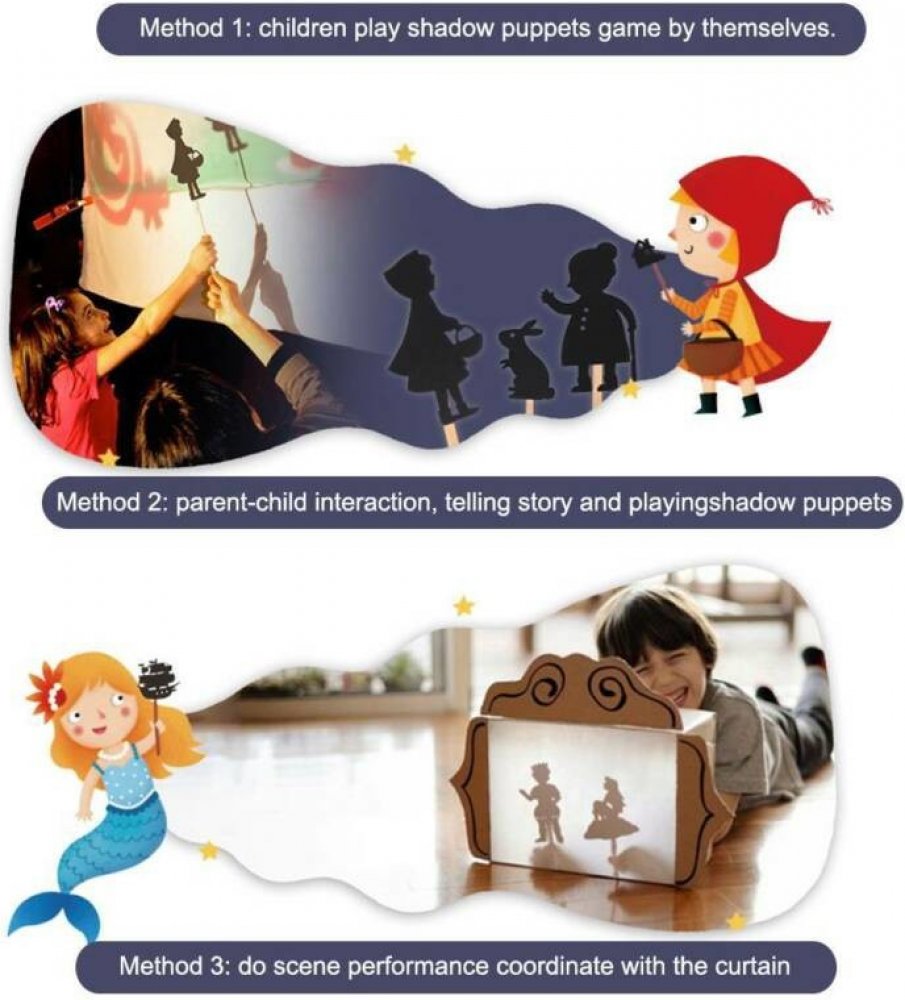 Stínové divadlo je obdobou původního černého divadla, jehož prapočátky spadají do období starověké Číny. Stínové divadlo funguje na principu postaviček, které dělají proti světlu stíny a jejich pohybem se může začít hrát divadlo. Ideální hra pro rodiče s dětmi. Tato hra pomáhá zvyšovat dětskou představivost hravost a zvyšovat jazykové dovednosti. Set obsahuje celkem 12 ks postaviček z pohádky O ka...