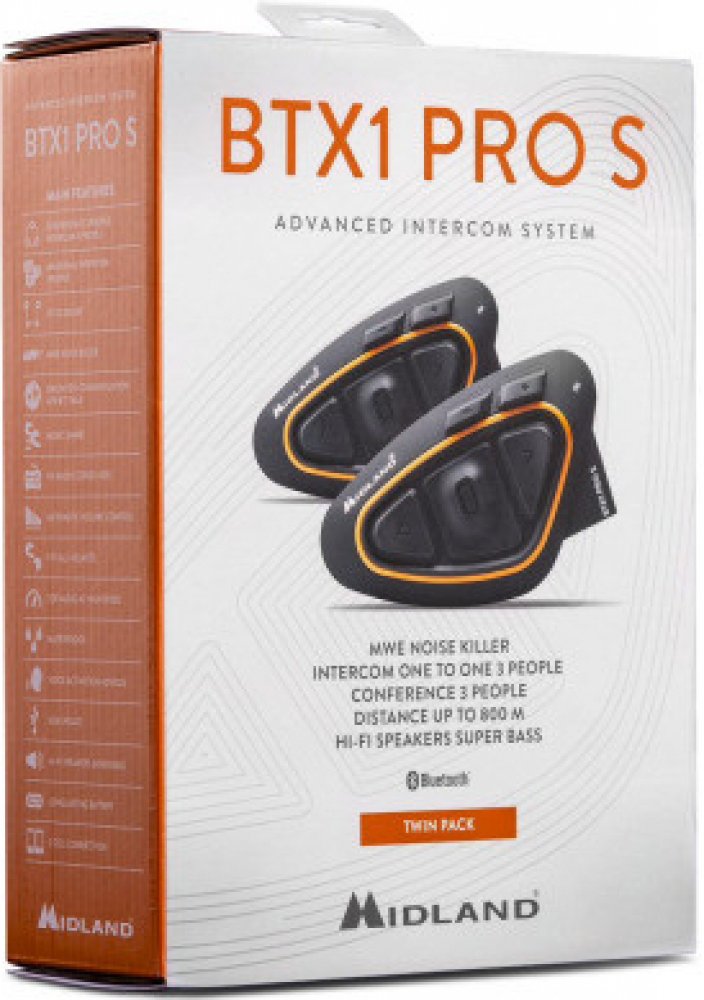 Interkom na moto, 2 ks v balení. Spojení až se 4 přístroji v režimu 1-1 nebo konference. Bluetooth, A2DP pro stereo přehrávání hudby. FM rádio. Dosah až 800 m. DSP potlačení šumu. AGC automatické nastavení hlasitosti. Hlasové pokyny. Možnost propojení s p