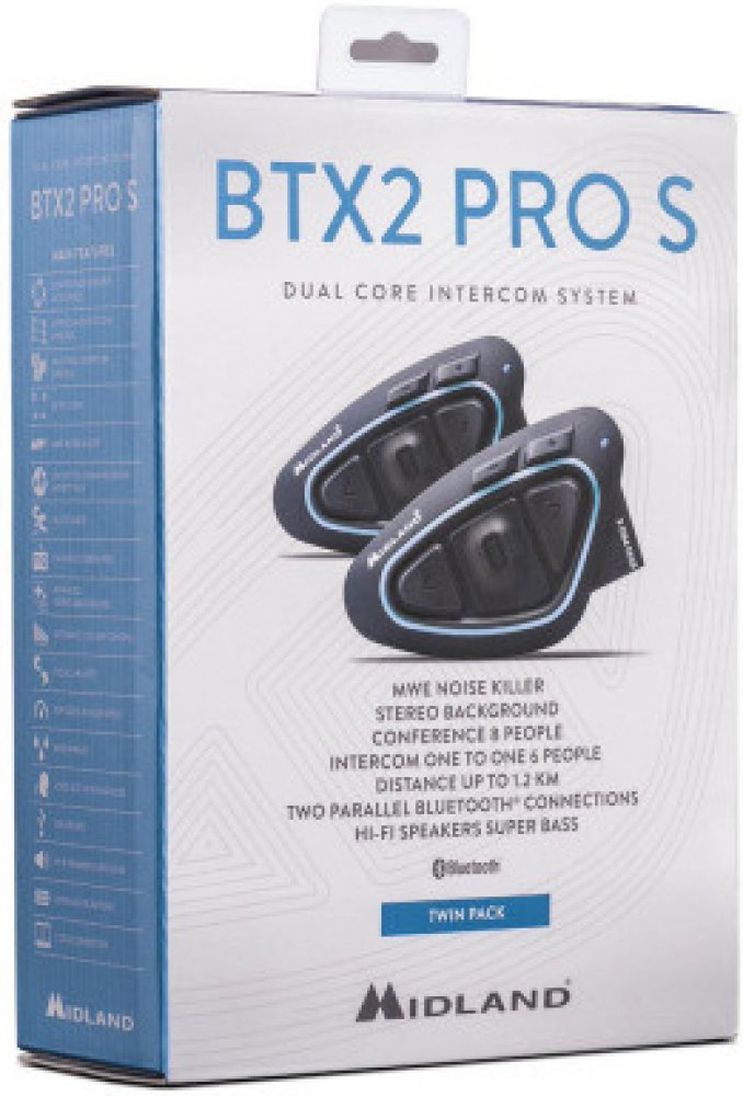 Midland BTX2 PRO S LR je prvý interkom strednej triedy, ktorý dokáže komunikovať s celkovo 8 ďalšími používateľmi. To všetko v plne duplexnom režime, s digitálnou kvalitou, systémom redukcie šumu DSP a systémom AGC (ktorý možno vypnúť) na automatickú úpravu hlasitosti na základe hluku v pozadí. Dosah BTX2 PRO S LR je až 1,6 km *. Interkomy Midland majú dva kanály vrátane funkcie "Talk to All", takže ich možno používať so zariadeniami iných značiek. Zdieľanie hudby, FM rádio s RDS a 6 prednastavenými stanicami, vox a hlasové povely, pripojenie k 2 mobilným telefónom súčasne, nastavenie na počítači alebo mobile, s aplikáciou BT Set App pre prispôsobiteľné nastavenia.