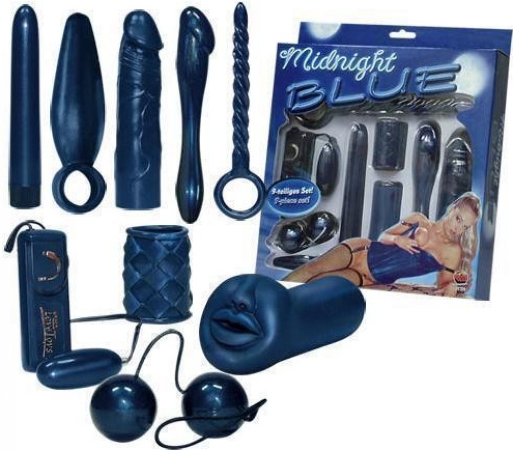 1) Anální vývrtku (23 x 1,5cm)2) Anální kolíček na prst (měkčený gel) (7 x 1-1,7cm) - na fotografii je zvětšený3) Umělou vagínu ze silikonu v délce 11cm - velmi elastickou4) Vibrační vajíčko s ovládačem (6 x 2,5cm) 5) Venušiny kuličky (Ø 3,3cm)6) Návlek na penis se stimulačními výstupky (5,5 x 3cm) - elastický 7) Dvojité dildo - hladké a poddajné - vaginální i anální8) Výkonný vibrátor (17,5 x 2,5cm)9) Silikonový návlek na vibrátor nebo menší penis (17 x 2cm) - který může zvětšit průměr až o 1cm