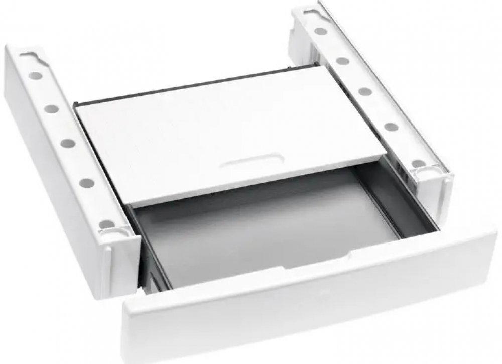 Souprava se zásuvkou pro bezpečnou instalaci pračky a sušičky Miele řady White Edition na sebe.