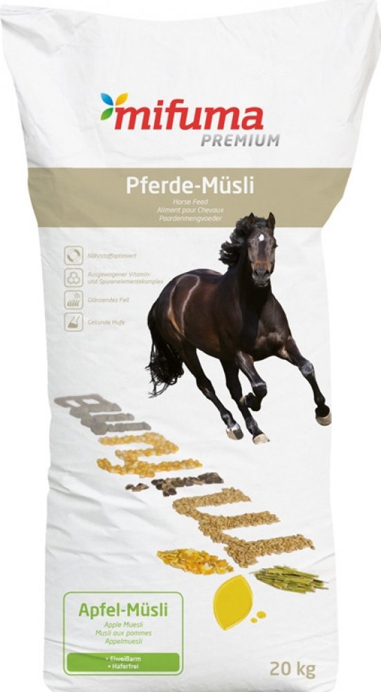 Mifuma APFEL-MÜSLI obsahuje hodnotné vitaminy, minerály a živiny. Obilné vločky zvyšují stravitelnost, kombinace rychle a pomalu stravitelných dodavatelů energie je prospěšná dobré kondici, temperament zvířat přitom zůstává pod kontrolou. Mifuma APFEL-MÜSLI obsahuje Dumosweet®, což je cukerná látka s nepatrným glykemickým indexem. Tato pomáhá udržovat konstantní hladinu krevního cukru a hodně tak usnadňuje látkovou výměnu.