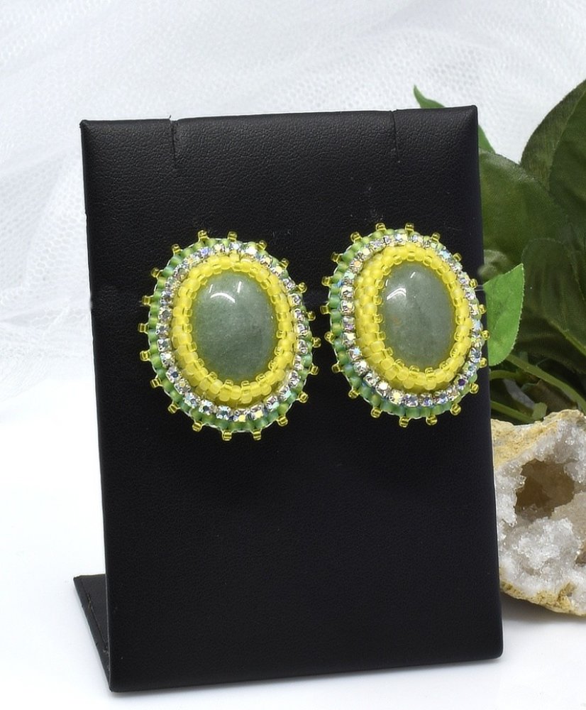 Elegantním řešením, když si chcete ozdobit uši náušnicemi, ale nemáte propíchnuté ušní lalůčky, jsou náušnice s klipsovým zapínáním. Autorské klipsové náušnice jsou zhotoveny z kabošonů zeleného avanturínu, které jsou obšité štrasovým prýmkem a skleněným japonským rokajlem Toho Round ve zeleném a žlutém provedení.