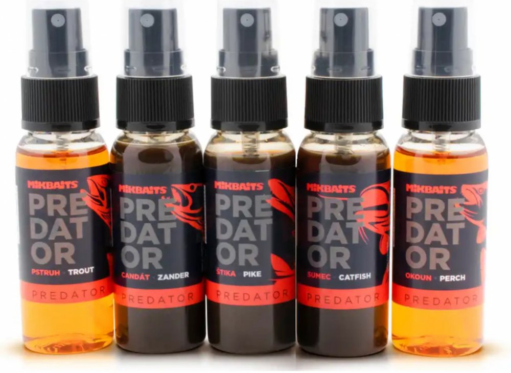 PREDATOR Spray je určený na postřik umělých (gumové nástrahy, ale i střapce třpytek a woblerů atd), mrtvých (rybky) i jiných (pelety,…) nástrah s účinností na jednotlivé druhy ryb – Štika, Candát, Okoun, Sumec a Pstruh.
