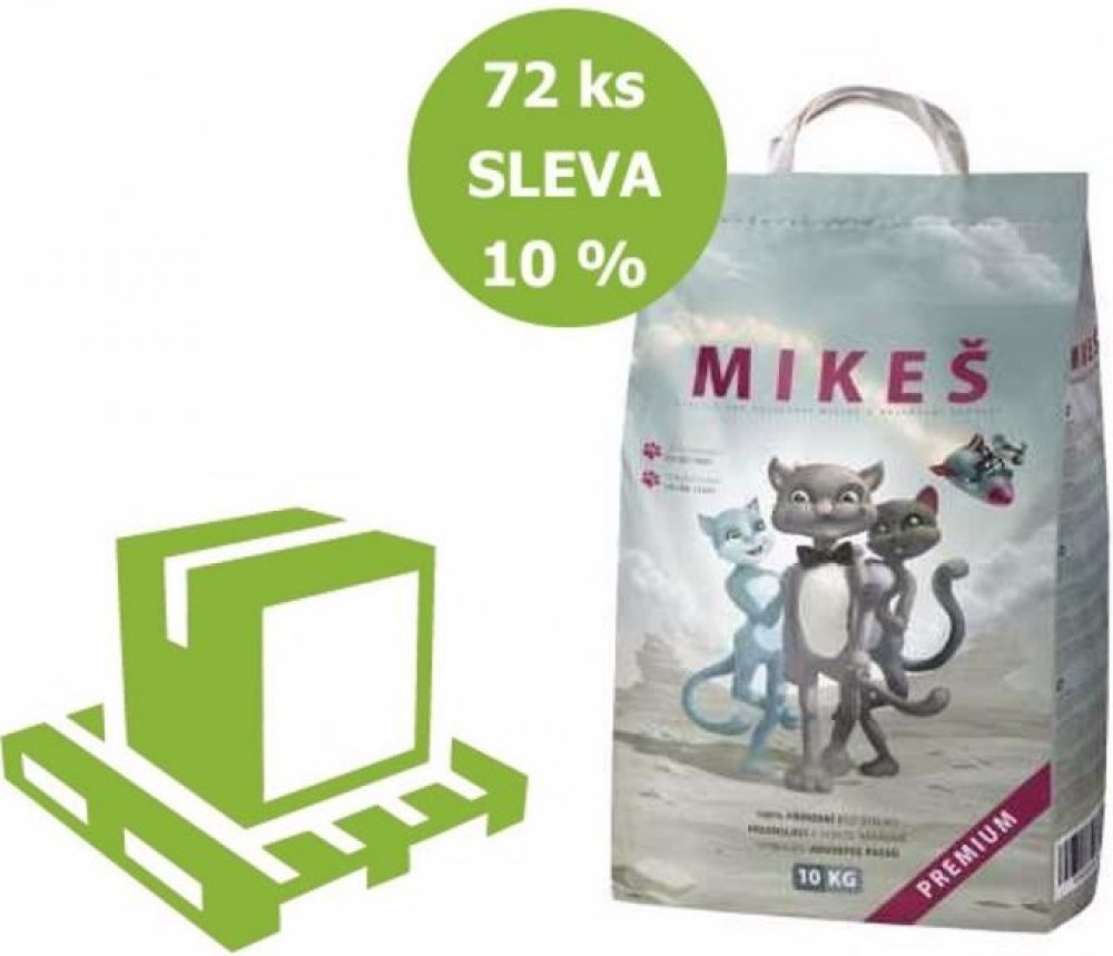 MIKEŠ PREMIUM - Přírodní hrudkující stelivo. MIKEŠ je určený nejen kočkám, ale i ostatním drobným domácím zvířátkům. Vytváří pro zvířátka naprosto přirozené prostředí, pohlcuje pachy a vlhkost a celkově zvyšuje hygienu chovu zvířat. POUŽITÍ : Po odstranění hrudky, která se vytvoří při styku s výměškem zvířete, zůstává zbytek steliva v kočičí toaletě suchý a čistý. Hrudkující stelivo MIKEŠ je tedy velmi úsporným produktem. Výrobek je také velmi ceněn pro svou naprostou ekologickou nezávadnost. BALENÍ : 10 kg