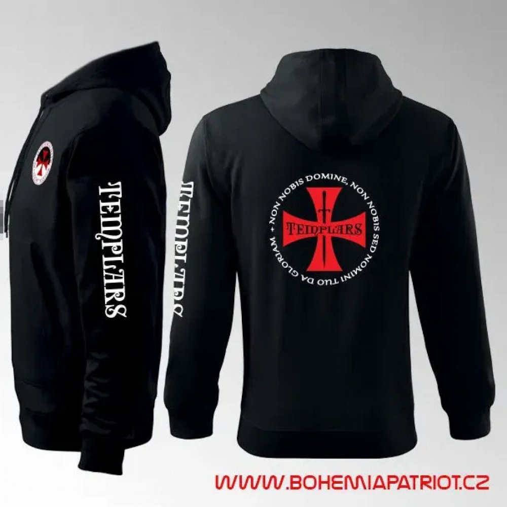 Templářská mikina s kapucí a potiskem Templář 2MZ. Potisk templářská pečeť na prsu, nápis na levém rukávu, velký potisk na zádech (cca 23 cm). Moderní mikina s kapucí, přední klokanková kapsa, celopropínací zip, výplňková pletenina, vnitřní strana počesaná, stahovací tkanička, 65% bavlna 35% polyester.