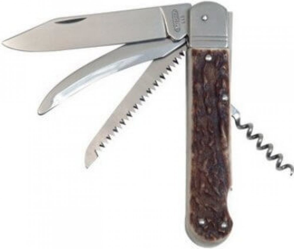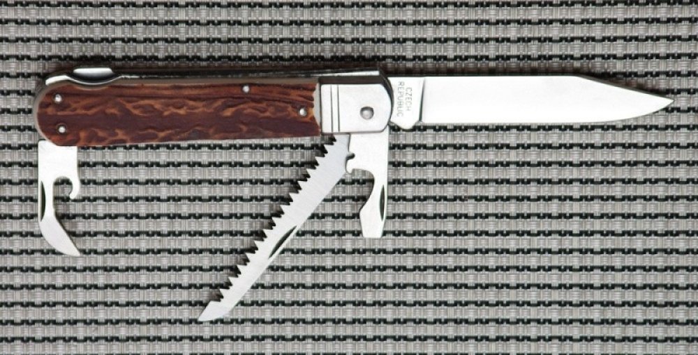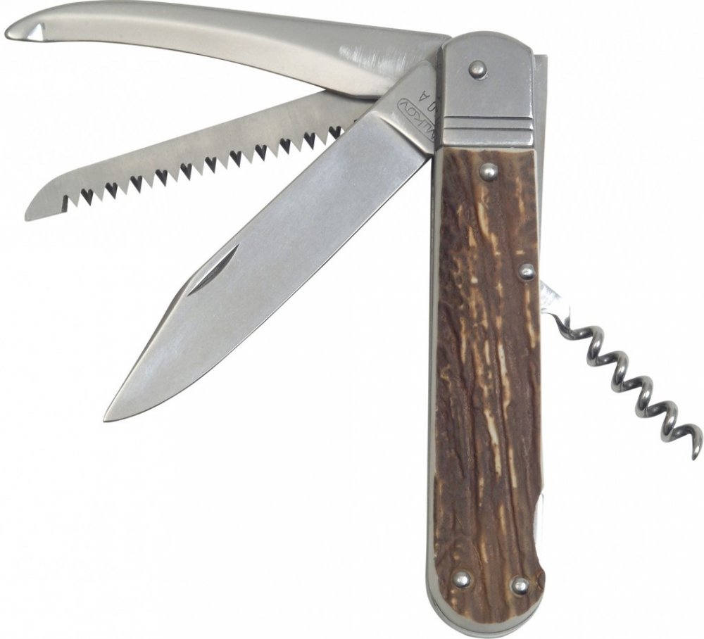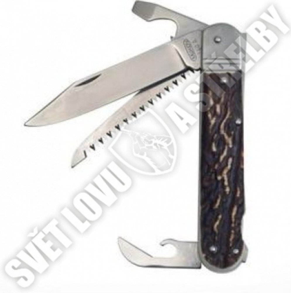 - Multifunkční vybavení: Nůž obsahuje pilku se dvěma řadami zubů, párák na zpracování zvěře a vývrtku, což z něj činí všestranný nástroj pro různé lovecké úkoly.