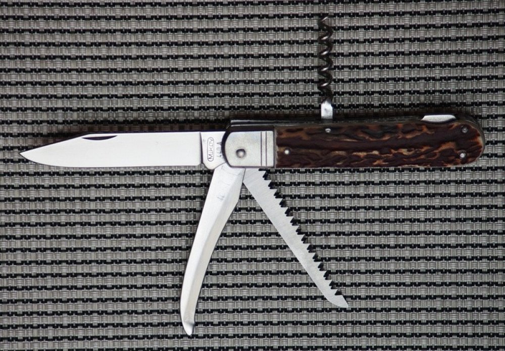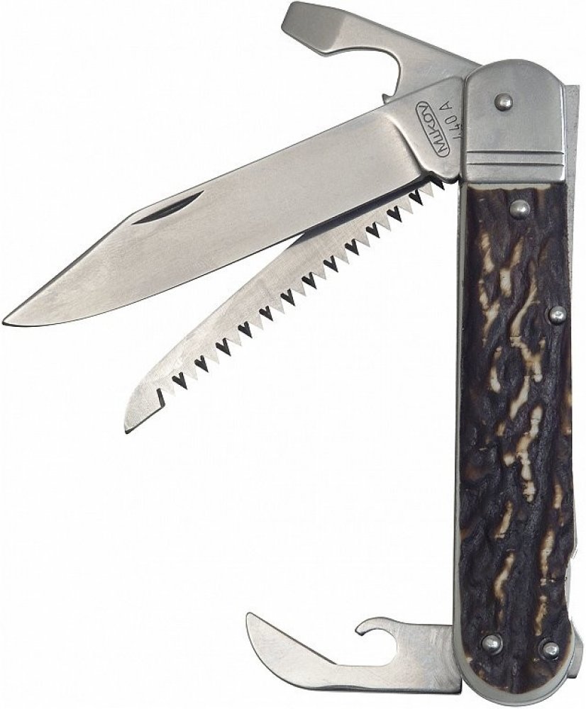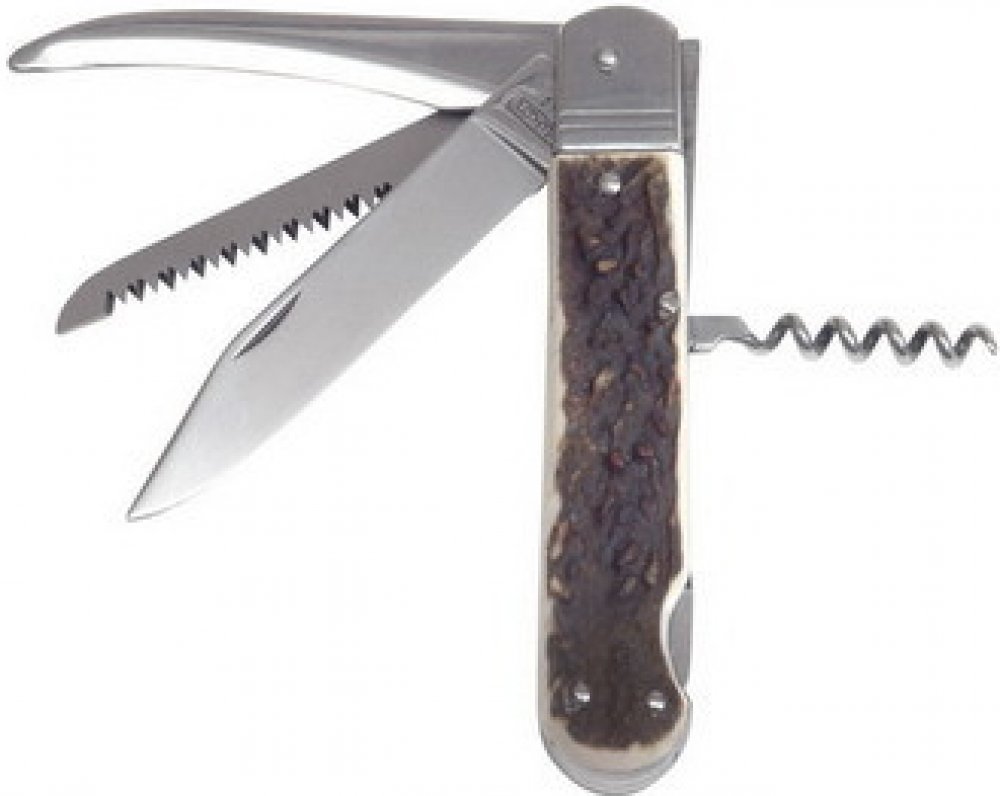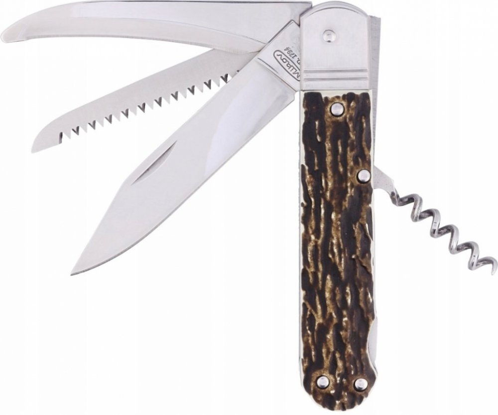 - Multifunkční vybavení: Nůž obsahuje pilku se dvěma řadami zubů, párák na zpracování zvěře a vývrtku, což z něj činí všestranný nástroj pro různé lovecké úkoly.