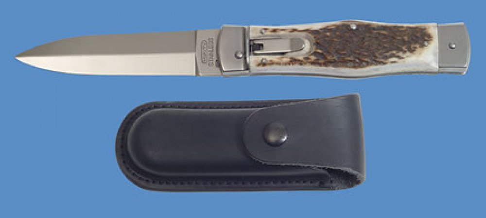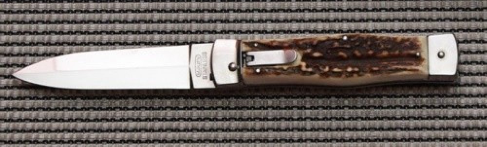 Vyhazovací nůž Mikov Predator 241-NP-1/Hammer s kováním má čepel vyrobenou z nerezové oceli 420. Střenka vyrobená z parohu má tvar, který perfektně padne do ruky. Nůž je dodáván včetně koženého pouzdra.