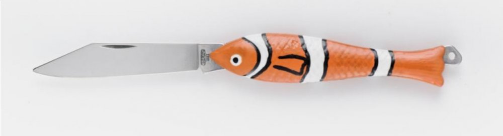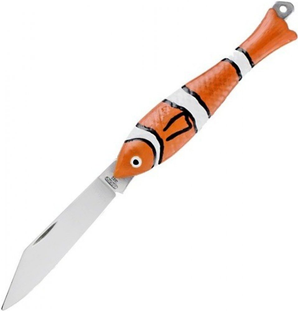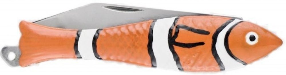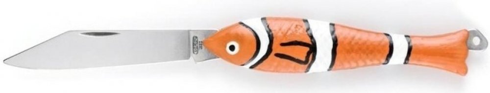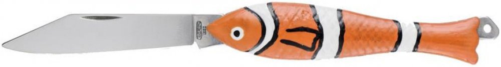 Kapesní nůž Rybička Clown 130-NZn-1 od českého výrobce Mikov Mikulášovice patří mezi originální zdobené nože vyráběné v limitovaných sériích. Tato speciální edice má střenky potištěné moderní technologií UV LED tisku, která dodává noži výrazné barvy a detailní motiv. Díky své barevnosti a hravému designu vyvolává příjemné vzpomínky na dětství a působí jako dekorativní dárkový předmět. Čepel je vyrobena z nerezové oceli 420 o tvrdosti 52–55 HRc, střenky ze zinkové slitiny. Nůž je uložen v plechové dárkové krabičce a doplněn ozdobnou karabinkou pro zavěšení.