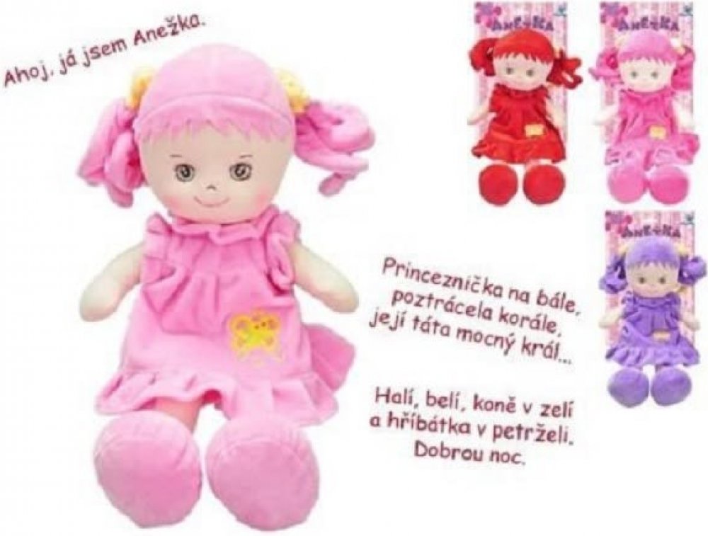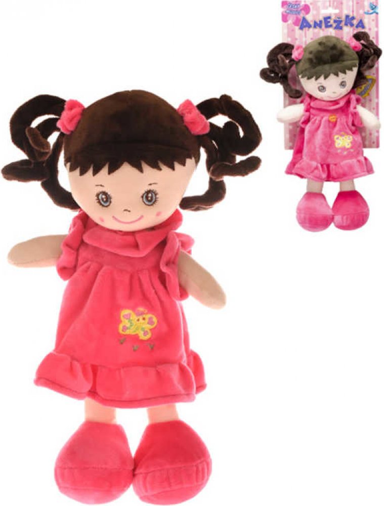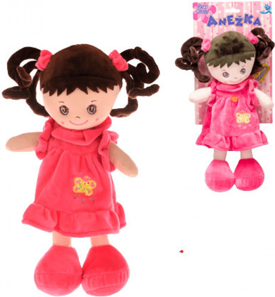 Usměvavá, měkká a lehká paneka holčička Anežka bruneta v šatičkách, s tmavými vlásky, s copánky, z plyše, která umí zpívat písničky a mluvit česky. Hračka na baterie se zvukem, česky mluvící.