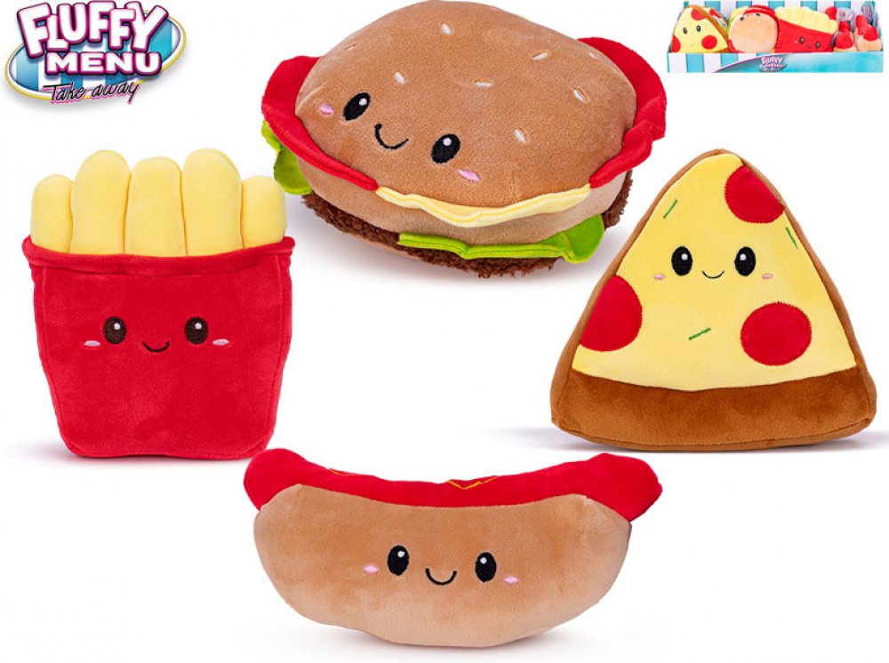 Specifikace: • typ: plyšové potraviny – Fast Food • obsah balení: hamburger, hranolky, pizza, hot dog • vhodné pro děti: 0+ • využití: kreativní hra, rozvoj fantazie, stolování