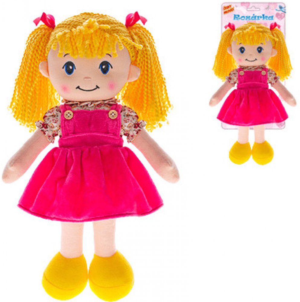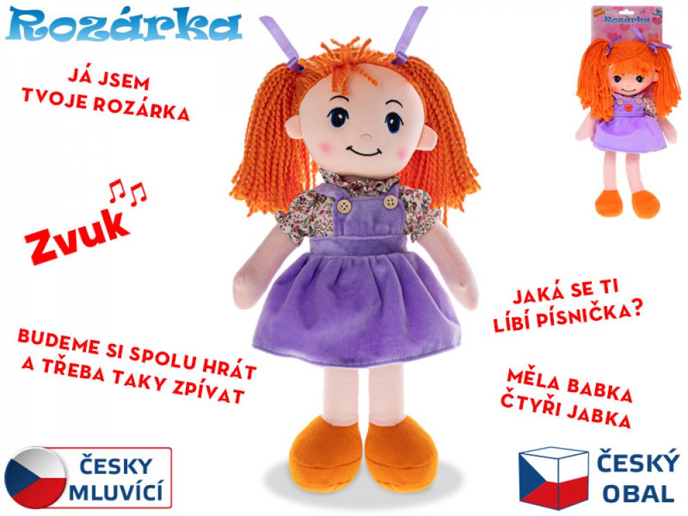 Česky mluvící panenka Rozárka s měkkým tělíčkem. "Já jsem tvoje ROZÁRKA, budeme si spolu hrát a třeba taky zpívat. Jaká se ti líbí písnička? Měla babka čtyři jabka .."