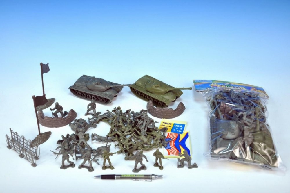 Dětský vojenský plastový army set s vojáky a doplňky z plastu v sáčku. Tahle krásná dětská vojenská sada udělá radost všem klukům, kteří si rádi hrají na vojáky