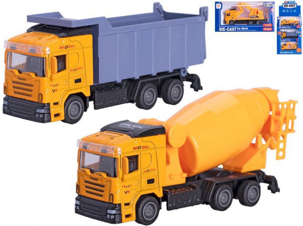Vozidlo stavební 13 cm 1:50 kov zpětný chod. Vozidlo stavební 13 cm 1:50 kov zpětný chod. V nabídce máme 3 druhy - míchačka, bagr, sklápěčka. Rozměr 13 cm. Materiál: kov.Doporučený věk 3+.Dodáváme dle aktuální skladové dostupnosti. Pokud požadujete určitý druh, tak to uveďte v poznámce objednávky. Uvedená cena je za jeden kus.