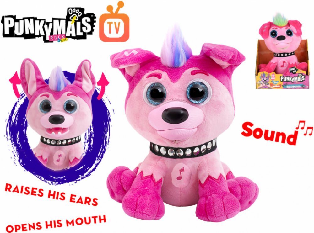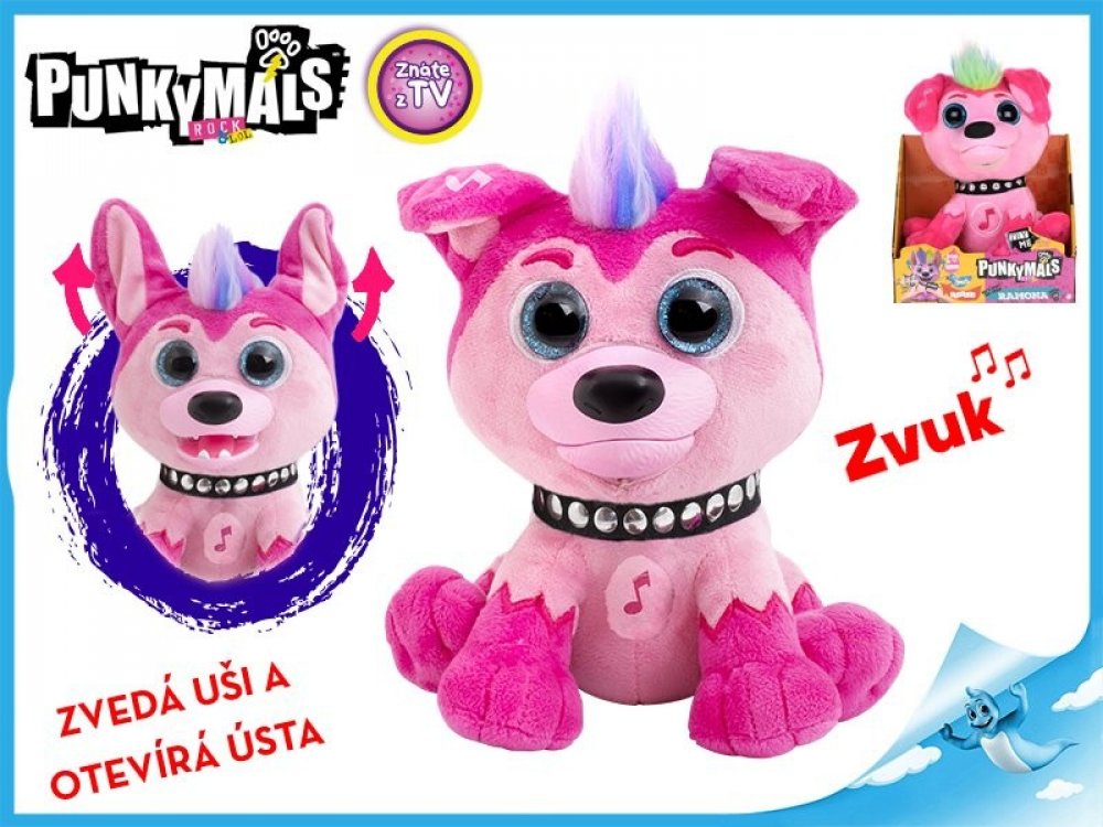Punkymals rockové zvířátko pejsek "Ramona" je crazy, zábavné a cool. Velikost zvířátka je 21cm, je na baterie, které jsou součástí balení. Plyšové zvířátko při stlačení noty na hrudníku vydává veselý zvuk v podobě