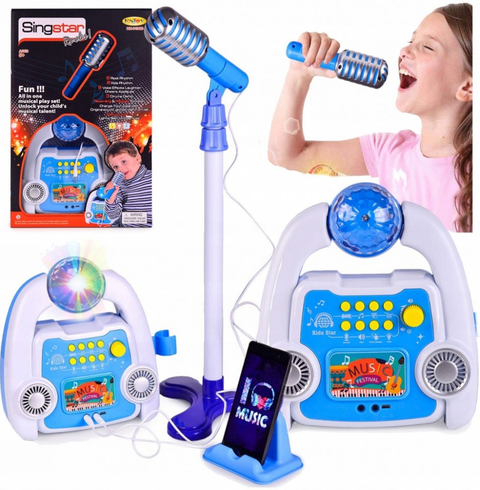 Všichni víme, jak malé děti milují poslouchat hudbu a psát texty svých oblíbených písní. Každý z nich sní o tom, že se v budoucnu stane skutečnou hvězdou estrády. Udělejte svému malému dítěti skvělé překvapení a pořiďte mu profesionální stativ s mikrofonem, poličkou např. pro telefon a syntezátor. Sada má nahrané melodie, možnost regulace zvuku a speciální efekty jako BRAWA A WIWAT. Světelné efekty hračky vytvoří vašemu dítěti atmosféru skutečné hudební scény. Stativ lze výškově nastavit – roste s vaším dítětem!