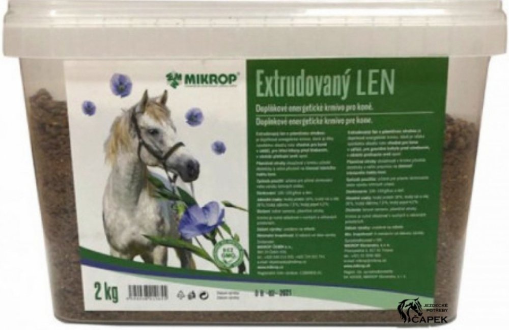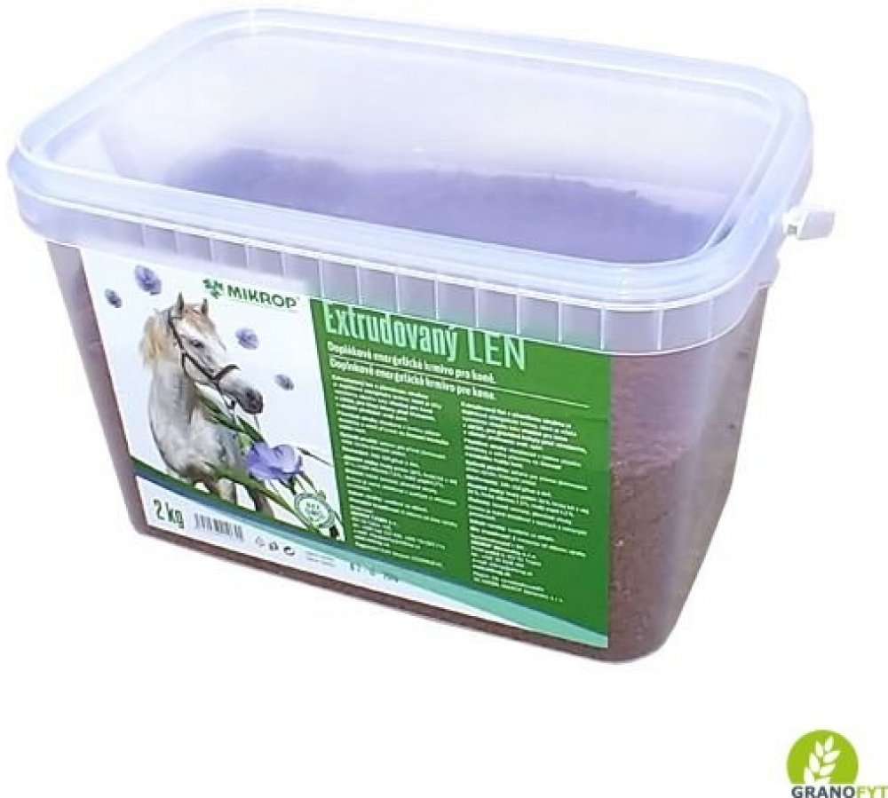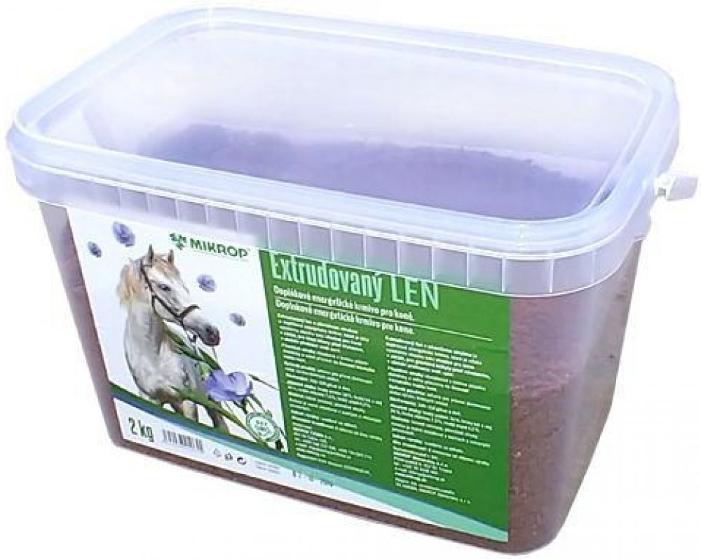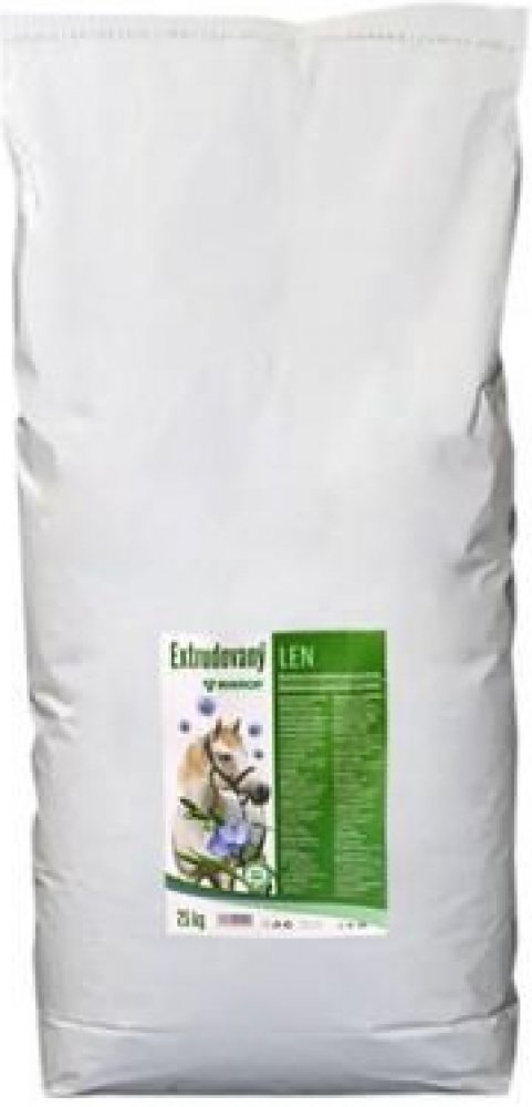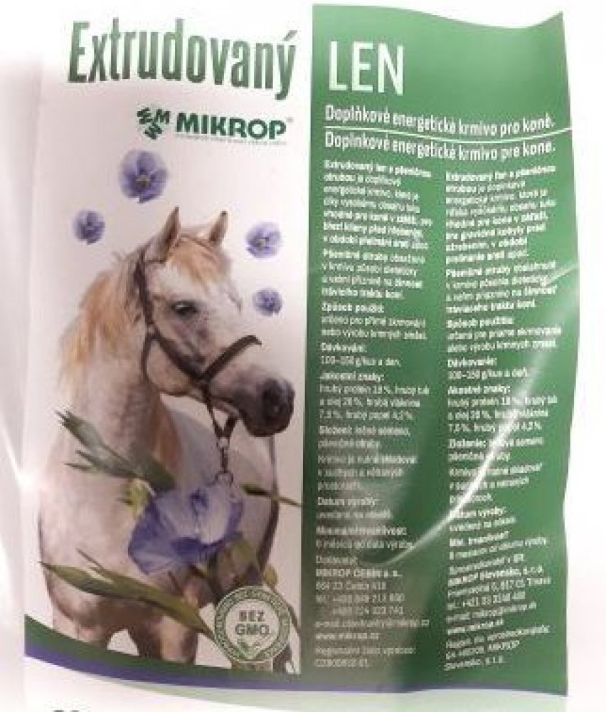 Doplněk stravy pro koně. Vhodný doplněk pro koně v zátěži, březí klisny před hřebením v období před přelínáním srsti u koní trpícími častými kolikami. Pro zlepšení kvality srsti. Extrudovaný len se nespařuje ani nevaří pouze se nasype do krmení.