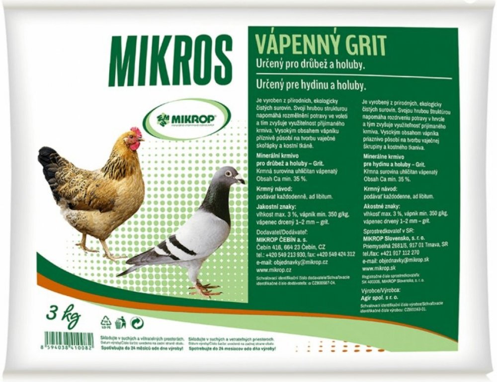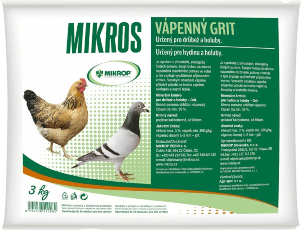 Minerální krmivo pro drůbež a holuby. Vyrobeno z přírodních, ekologicky čistých surovin. Svojí strukturou napomáhá rozmělnění potravy ve voleti a tím zvyšuje využitelnost přijímaného krmiva. Vysokým obsahem vápníku příznivě působí na tvorbu vaječné skořápky a kostní tkáně.