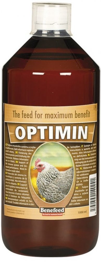Podpora imunitního systému a zvýšení užitkovosti.OPTIMIN je výborným doplňkem výživy zvířat v zajetí, která nemohou využít přirozeného výběru potravy dle aktuálních potřeb jejich organismu, které se navíc mění např. s věkem, požadavkem na vysokou užitkovost apod. Mnohdy proto dochází k oslabení obranyschopnosti imunitního systému těchto zvířat, která jsou pak velice náchylná k různým onemocněním. Narušením rovnováhy minerálních látek v organismu také dochází k problémům s užitkovostí, vitalitou apod.OPTIMIN obsahuje specifický komplex minerálních a dalších látek zohledňující individuální potřeby kategorie zvířat, pro kterou je určen. Minerální látky jsou ve formě, která zajistí maximální účinnost každého prvku tak, aby došlo k vyrovnání hladiny jednotlivých prvků v organismu. Optimální hladina všech prvků v organismu je mimo jiné zcela nezbytným předpokladem pro vysokou obranyschopnost a odolnost organismu např. proti infekčním a virovým chorobám. U užitkových zvířat jsou pak také eliminovány negativní důsledky poklesu užitkovosti z důvodu snížené hladiny makro a mikro prvků v organismu.Vysoká účinnost OPTIMINU je umocněna jak látkami přírodního charakteru, tak zejména specifickým poměrem elektrolytů, který je (obdobně jako obsah jednotlivých prvků) také optimalizován pro konkrétní kategorii zvířat. Díky nim se zrychluje přechod účinných látek přes buněční membránu do nitra buňky.OPTIMIN je z výše uvedených důvodů výrazně účinnější než jsou standardní tekuté minerální doplňky výživy zvířat (které však jsou již ze své podstaty až o 80% účinnější v porovnání s pevnou formou minerálních doplňků).Složení: minerální látky elektrolyty přírodní látky upravená pitná vodaKrmný návod: podává se v množství 10 ml na 1 litr napájecí vody po celý rok.Přípravek lze kombinovat a současně podávat s jakýmkoliv výrobkem značky BENEFEED® pro konkrétní kategorii zvířat. Seznam těchto výrobků najdete níže na této stránce, je zde však uvedeno pouze jedno balení každého výrobku. Další balení najdete v příslušné kategorii produktů.Skladování:Skladovat v suchém a temném prostředí v původních uzavřených obalech. Po otevření postupně spotřebujte, výrobek již dlohodobě neskladujte. Mikroskopické pevné částečky a mírný sediment je dán obsahem přírodních látek a není na závadu výrobku.