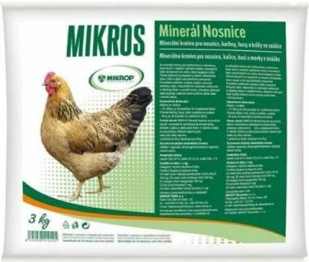 MIKROS NOSNICE je minerální krmivo s vitamíny pro drobnochovy a malochovy, které slouží k zajištění optimální hladiny minerálních látek, vitamínů a aminokyselin nezbytny´ch pro vy´živu dané kategorie hospodářsky´ch zvířat.
