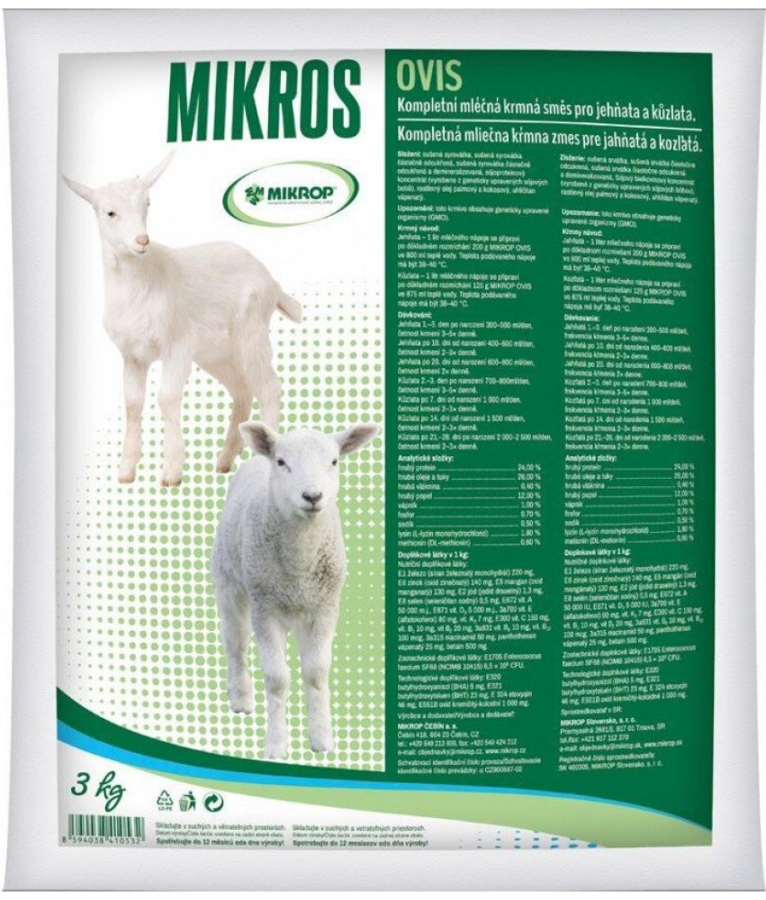 Sušené mléko Mikrop Ovis se svými parametry se přibližuje složení ovčího mléka. S využitím mléčné krmné směsi MIKROP OVIS je možné praktikovat dřívější přechod na mléčnou krmnou směs v systému dvojího bahnění ročně, nebo trojího bahnění za 2 roky. Vhodný je i v případě úhynu kojící bahnice. Balení 3 kg, 25 kg.