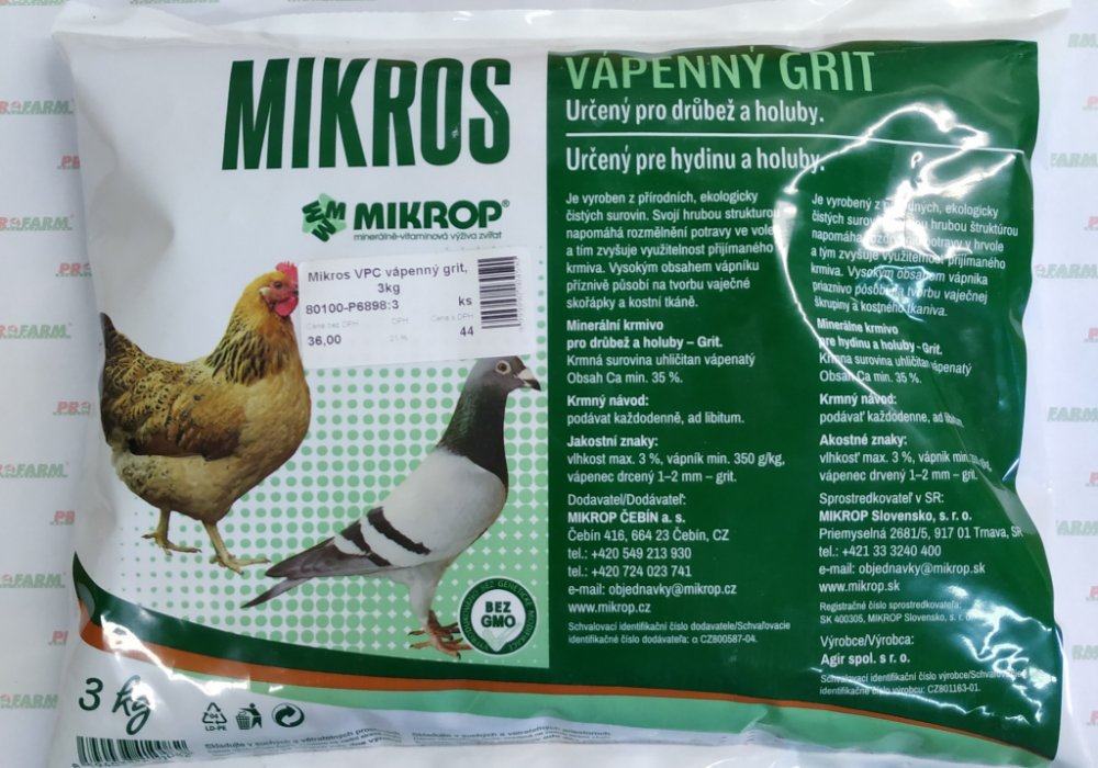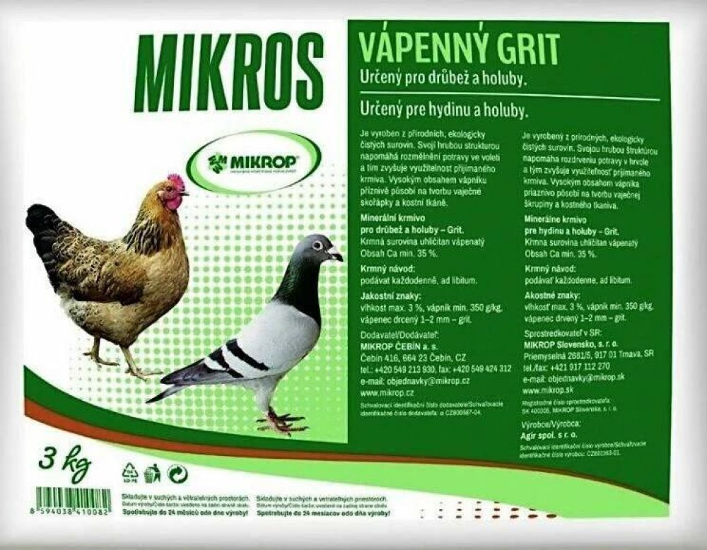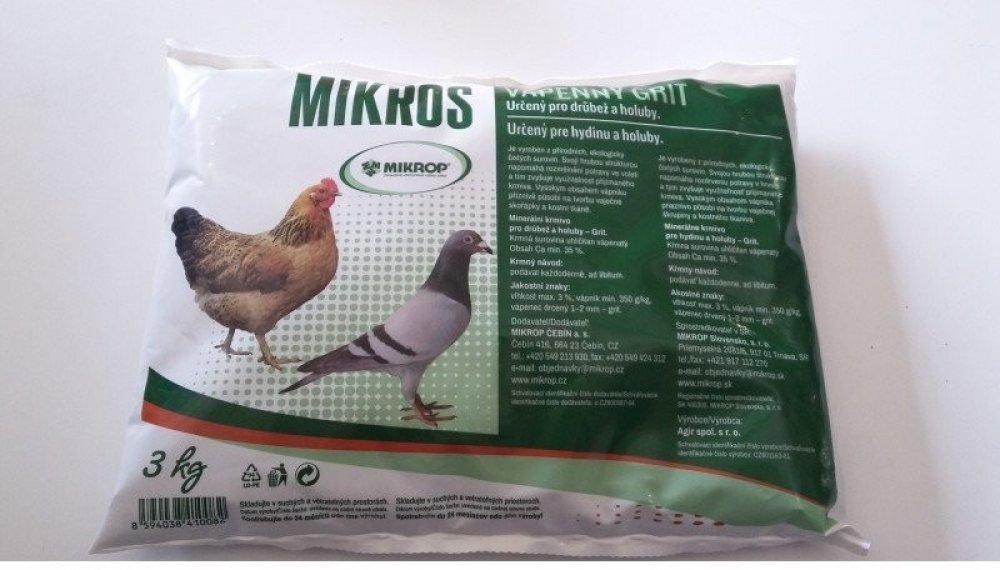 Minerální krmivo pro drůbež a holuby. Vyrobeno z přírodních, ekologicky čistých surovin. Svojí strukturou napomáhá rozmělnění potravy ve voleti a tím zvyšuje využitelnost přijímaného krmiva. Vysokým obsahem vápníku příznivě působí na tvorbu vaječné skořápky a kostní tkáně.