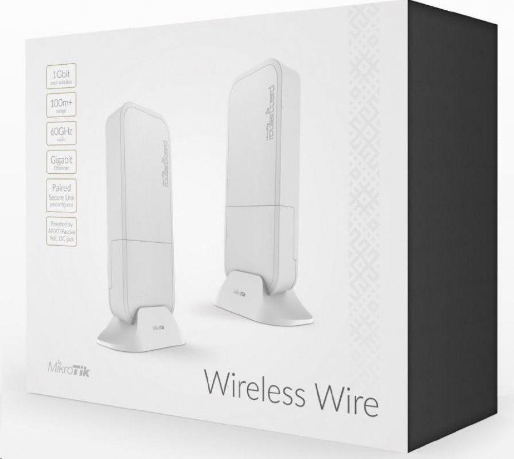 2x Montážní kit na zeď, šroubky, imbusRBwAPG-60ad je naprosto revoluční novinka v MikroTik sortimentu, která osloví každého ISP, který vytváří spoje na krátké vzdálenosti. RBwAPG-60ad je kompletní bezlicenční spoj v 60GHz pásmu pracující se standardem 802.11ad, který v reálném provozu umožňuje propustnost až 1000Mbps Full Duplex a to na vzdálenost do 100m. RouterBoard je jako vždy vybaven velmi oblíbeným operačním systémem RouterOS s L3 licencí.