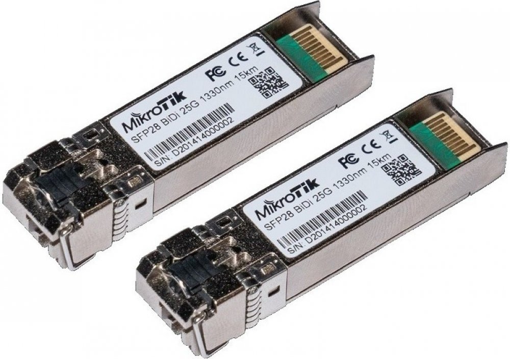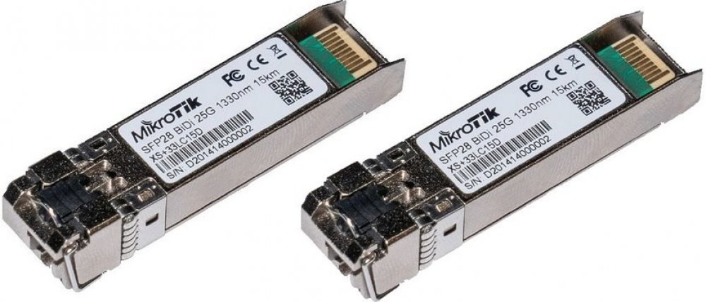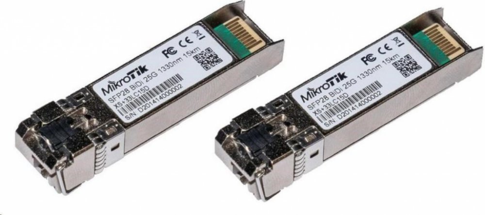 XS+2733LC15D je kit dvou kusů singlemode SFP28 modulů s přenosovou rychlostí až 25 Gbps (zpětně kompatibilní i s 10G i 1G), se simplexním optickým konektorem typu LC a výkonem na trasu o délce až 15 km. Vlnové délky modulů jsou 1270/1330 nm (Tx/Rx) a 1330/1270 nm (Tx/Rx).