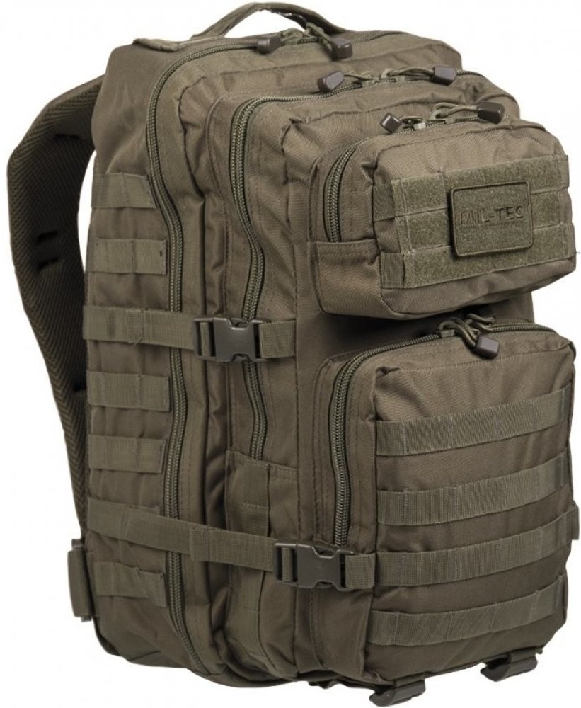 Batoh Mil-Tec US ASSAULT 36l Green. Taktický batoh Mil-Tec US ASSAULT v zeleném provedení se dvěma velkými komorami je vyroben z odolného polyesteru, který je dodatečně pokryt ochrannou vrstvou PVC pro zabezpečení proti vlhkosti.