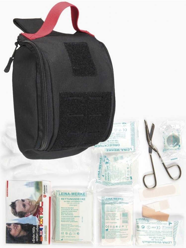 Lékárnička je umístěná v sumce z odolného polyesteru s voděodolnou úpravou. Snadný přístup k obsahu je zajištěn klasickým i suchým zipem. Uvnitř najdete široké spektrum základního zdravotnického vybavení pro ošetřování zranění. Vše je pevně připevněno v praktických úchytech, takže se nic volně nepohybuje ani při běhu. Přední klopa je opatřena laserem řezanou MOLLE vazbou a velcro plochou pro připevnění ID označení. V případě potřeby lze v krizových situacích celou sumku jedním trhnutím za červené madlo rychle odepnout. Lékárničku lze nosit na pásku, batohu, nebo dalších součástech výstroje.