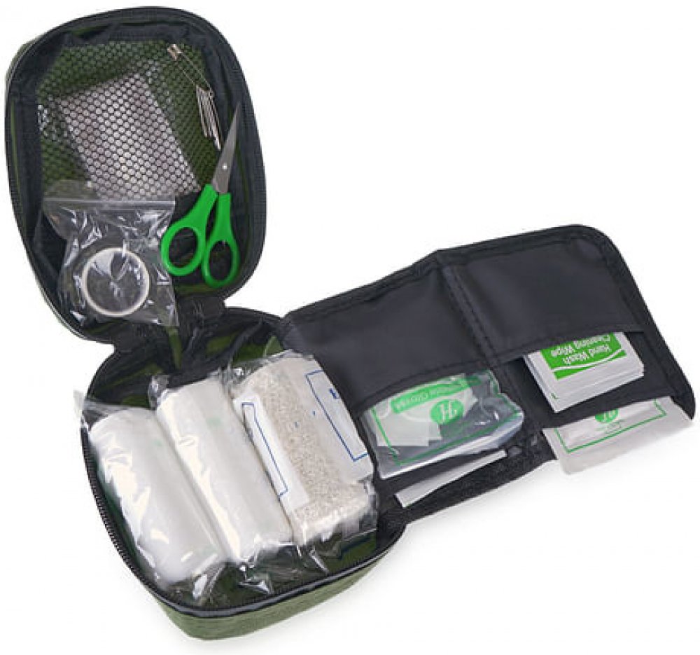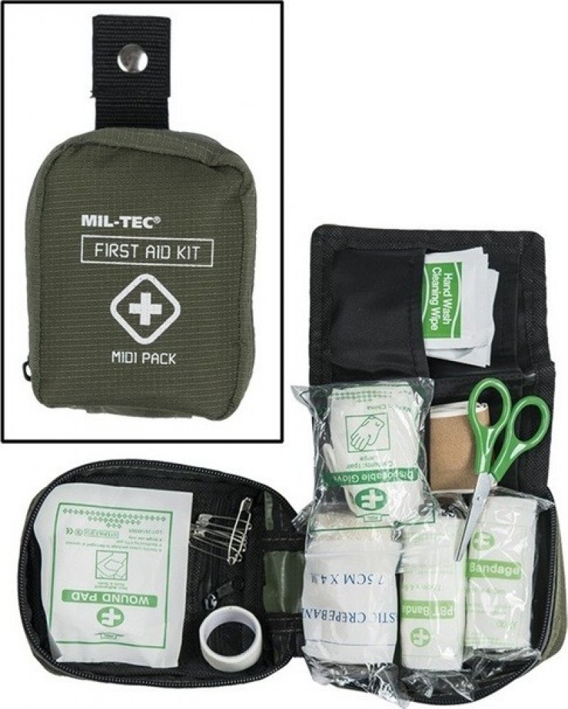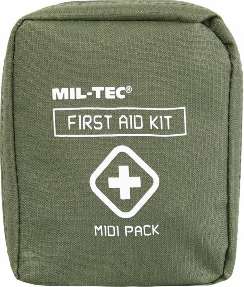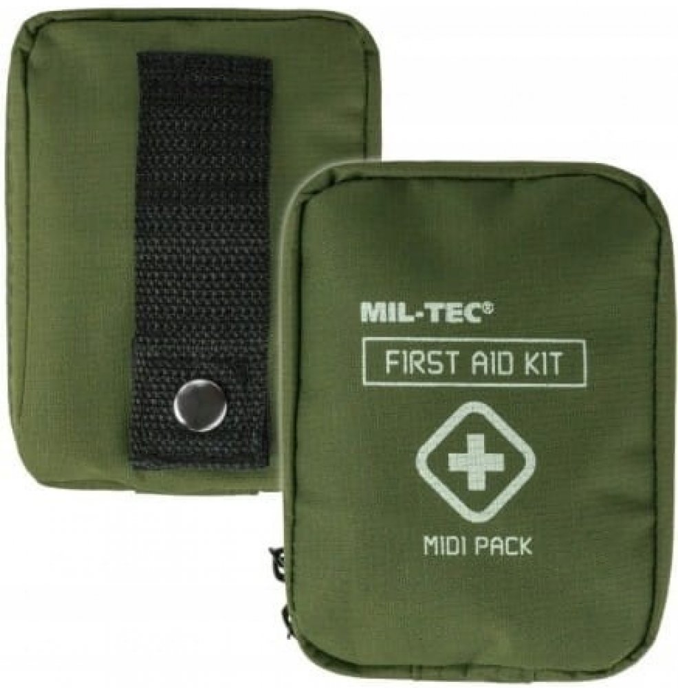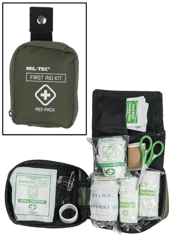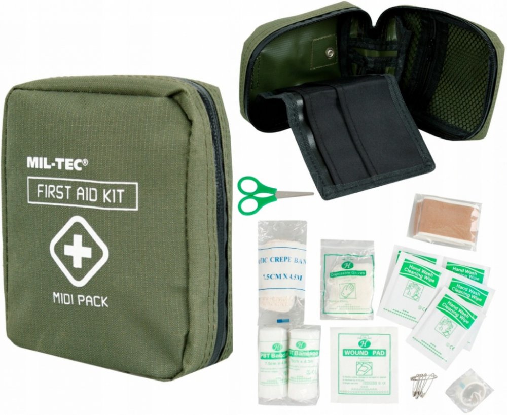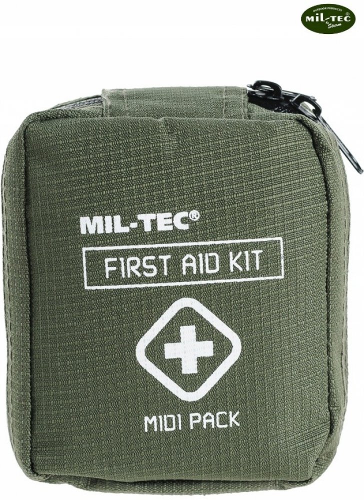 Středně velká vybavená lékárnička první pomoci. Kromě samotné výbavy obsahuje několik přihrádek.