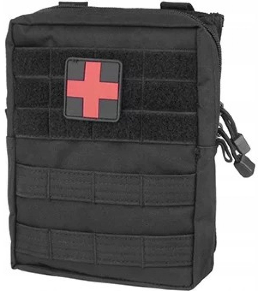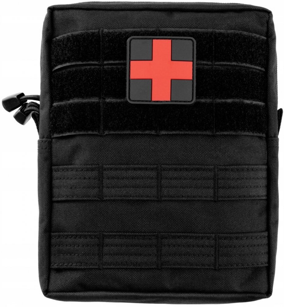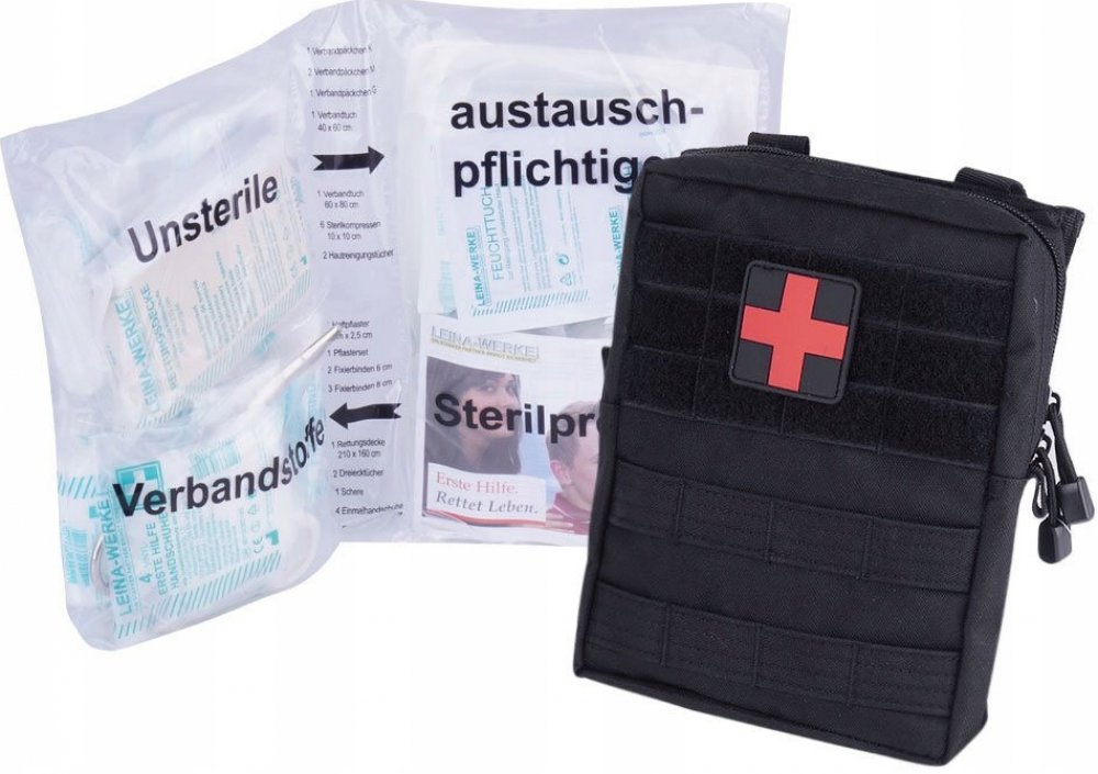 Lékárnička MOLLE 43-piece First Aid Set s obsahem vyrobeným společností Leina-Werke GmbH. Vše je uzavřeno v pouzdře Belt Pouch Large v černé barvě.