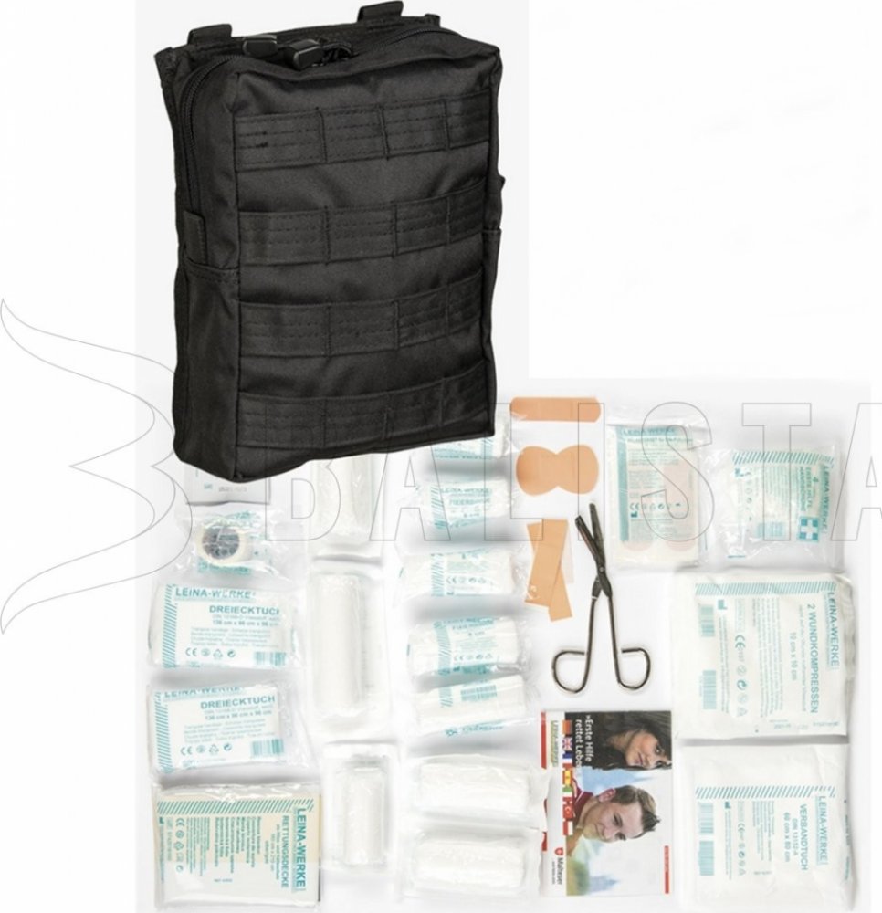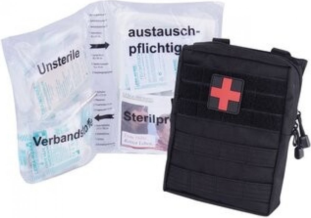 Lékárnička Mil-Tec Molle velká černá. Jde o lékárničku s kompletní výbavou umístěnou v taktickém obalu, který si hravě připojíte k většině platforem s vazbami Molle.