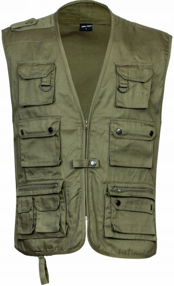Miltec olivova XL 10701001-905 Víceúčelová vesta od výrobce Miltec s množstvím kapes různých velikosti (celkem 14 vnější i vnitřních kapes) Má zdvojený materiál, komfortní zip krytý légou se zapínáním na druky. Výrobce dbal na kvalitu. materiál je kvalitní a odolný. Na zádech má velká kapsa s postranním otvorem a na pravém rameni nárameník se zapínáním na knoflík. Materiál 65% polyester, 35% bavln...