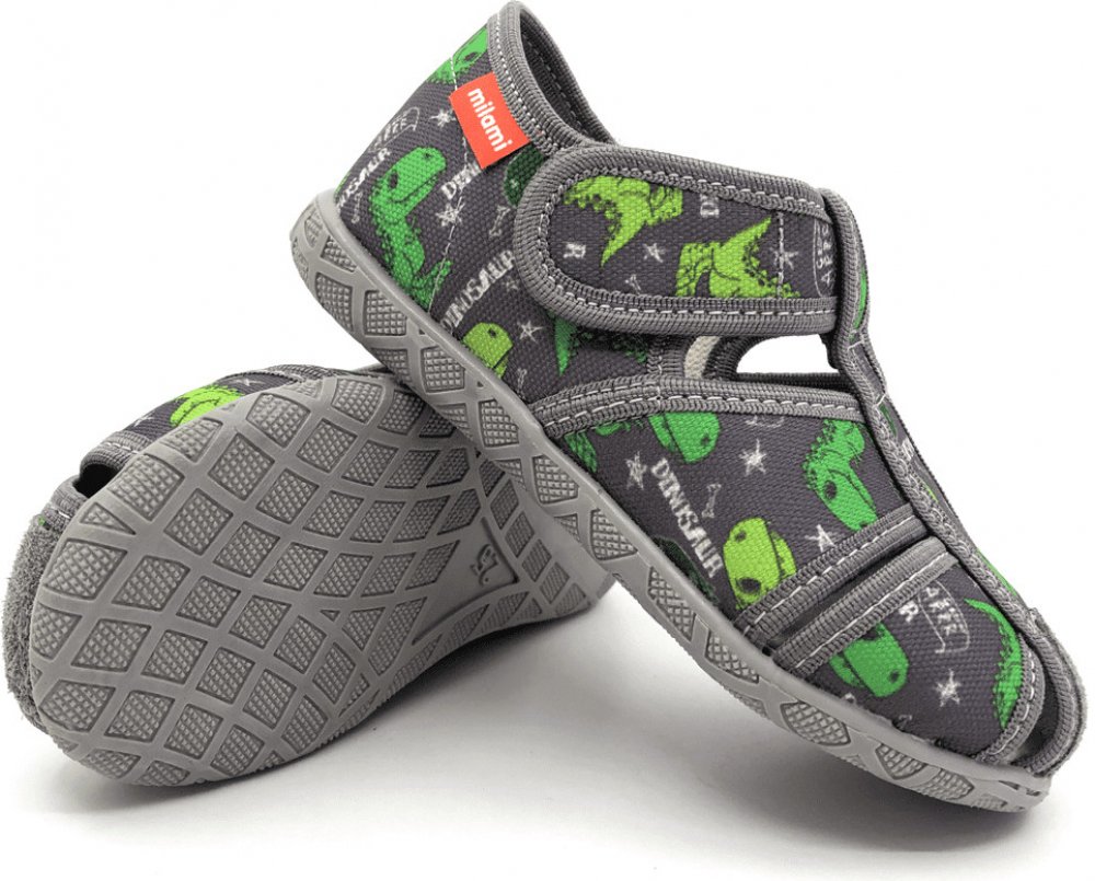 Dětské bačkory srbského výrobce Milami z řady 115 lze nosit v létě také jako textilní sandálky na ven. Řada 115 má odolnější podrážku než řady 226 a 227. Špička je opatřena praktickým okopem z broušené kůže, který brání prošoupání při hrách na koberci nebo venku. Sandálky mají zpevněný opatek a stélku z kůže, která je pevně přišita k botě. Svojí šířkou jsou vhodné na normální šířku nohy a jsou vhodné i na vyšší nárt. Sandálky Milami 115-4DINO Grey jsou šedé barvy s obrázky zelených dinosaurů. - Sednou na: normálně široké nožky, vhodné i na vyšší nárt, nejsou vhodné na výrazně dominantní palec (když je palec výrazně delší než ostatní prsty) - Zapínání: na suchý zip, vhodné i na vyšší nárt. - Opatek: zpevněný - Podrážka: lepená, pevnější a odolnější - Stélka: kožená stélka je pevně přišita k botě SLOŽENÍ: Svršek - textil + broušená kůže, stélka - kůže, podrážka - syntetika Velikost - vnitřní délka: 19 - 13,0 cm 20 - 13,6 cm 21 - 14,1 cm 22 - 14,8 cm 23 - 15,5 cm 24 - 16,1 cm 25 - 16,7 cm 26 - 17,5 cm 27 - 18,1 cm 28 - 18,6 cm 29 - 19,4 cm 30 - 19,9 cm