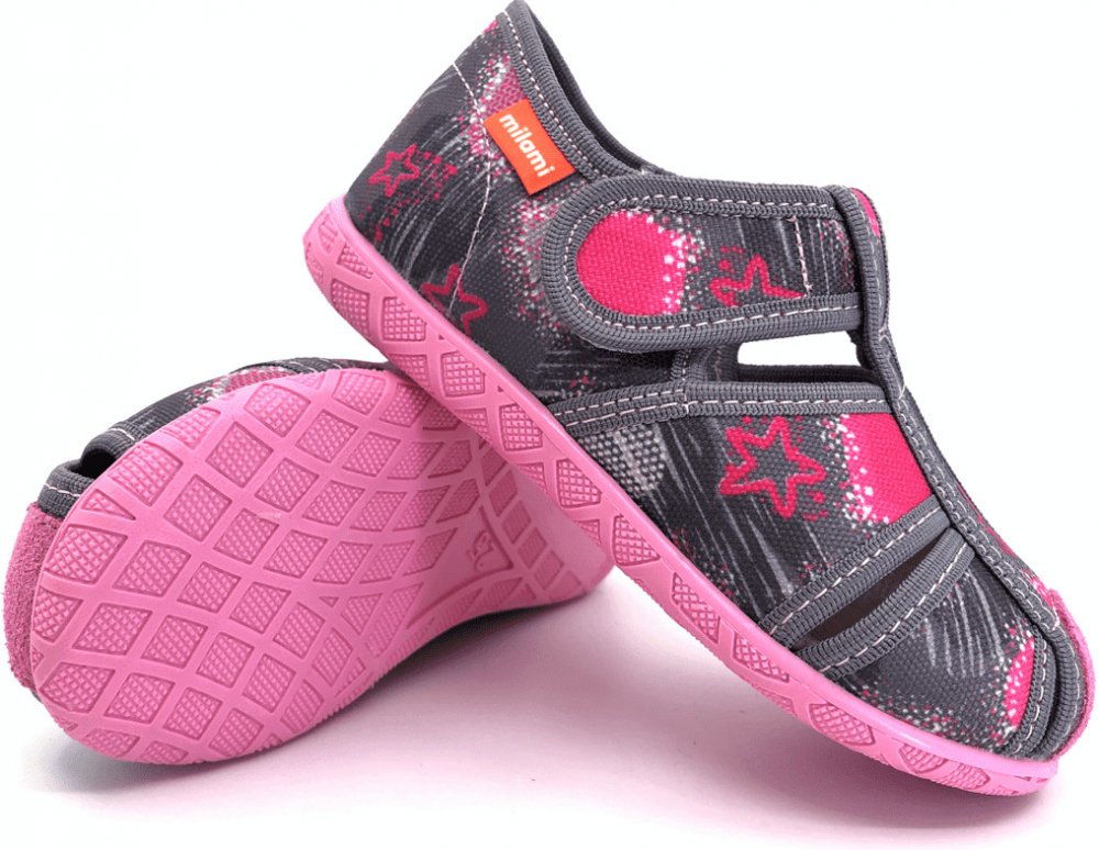 Dětské bačkory srbského výrobce Milami z řady 115 lze nosit v létě také jako textilní sandálky na ven. Řada 115 má odolnější podrážku než řady 226 a 227. Špička je opatřena praktickým okopem z broušené kůže, který brání prošoupání při hrách na koberci nebo venku. Sandálky mají zpevněný opatek a stélku z kůže, která je pevně přišita k botě. Svojí šířkou jsou vhodné na normální šířku nohy a jsou vhodné i na vyšší nárt. Sandálky Milami 115-4SR Grey jsou šedé s růžovou podrážkou a s růžovými hvězdami a srdíčky. - Sednou na: normálně široké nožky, vhodné i na vyšší nárt, nejsou vhodné na výrazně dominantní palec (když je palec výrazně delší než ostatní prsty) - Zapínání: na suchý zip, vhodné i na vyšší nárt. - Opatek: zpevněný - Podrážka: lepená, pevnější a odolnější - Stélka: kožená stélka je pevně přišita k botě SLOŽENÍ: Svršek - textil + broušená kůže, stélka - kůže, podrážka - syntetika Velikost - vnitřní délka: 19 - 13,0 cm 20 - 13,6 cm 21 - 14,1 cm 22 - 14,8 cm 23 - 15,5 cm 24 - 16,1 cm 25 - 16,7 cm 26 - 17,5 cm 27 - 18,1 cm 28 - 18,6 cm 29 - 19,4 cm 30 - 19,9 cm