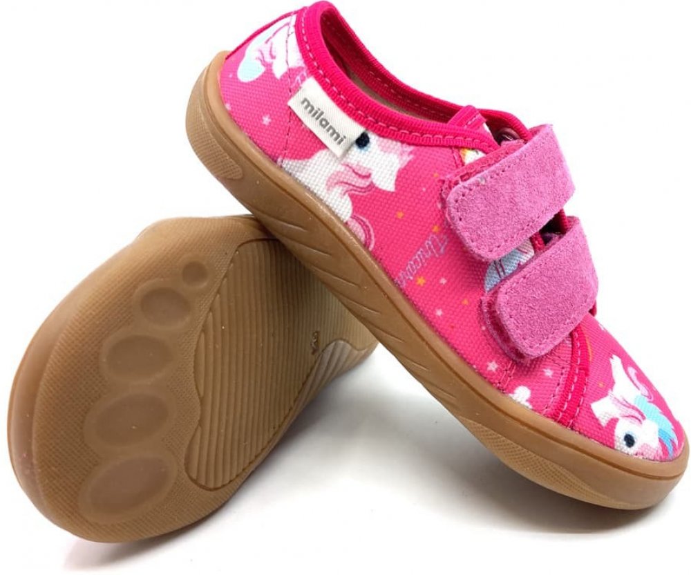 Dívčí barefoot textilní tenisky BF3 ZAA0502A v tmavě růžové barvě fuxia jsou novinkou srbského výrobce Milami. S oblíbeným motivem jednorožců.
