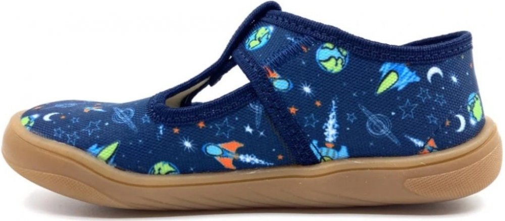 Barefoot textilní prodyšné přezůvky v tmavě modré barvě. Díky pásku na suchý zip lze snadno dotáhnout na konkrétní šíři nohy. Jsou vhodné i pro vyšší nárt. Bačkory jsou lehké a ohebné s kulatější špičkou. Pěnová stélka. Vyztužená pata je vhodná k zamezení šmajdání.