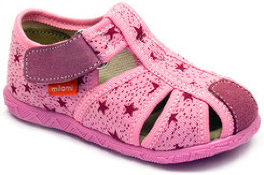 Dívčí sandálové bačkory Milami se zapínáním na suchý zip. Lehké s ohebnou podešví, výhodou je kožená, anatomicky tvarovaná stélka a zpevněný opatek. Podešev vhodná i pro pobyt venku.