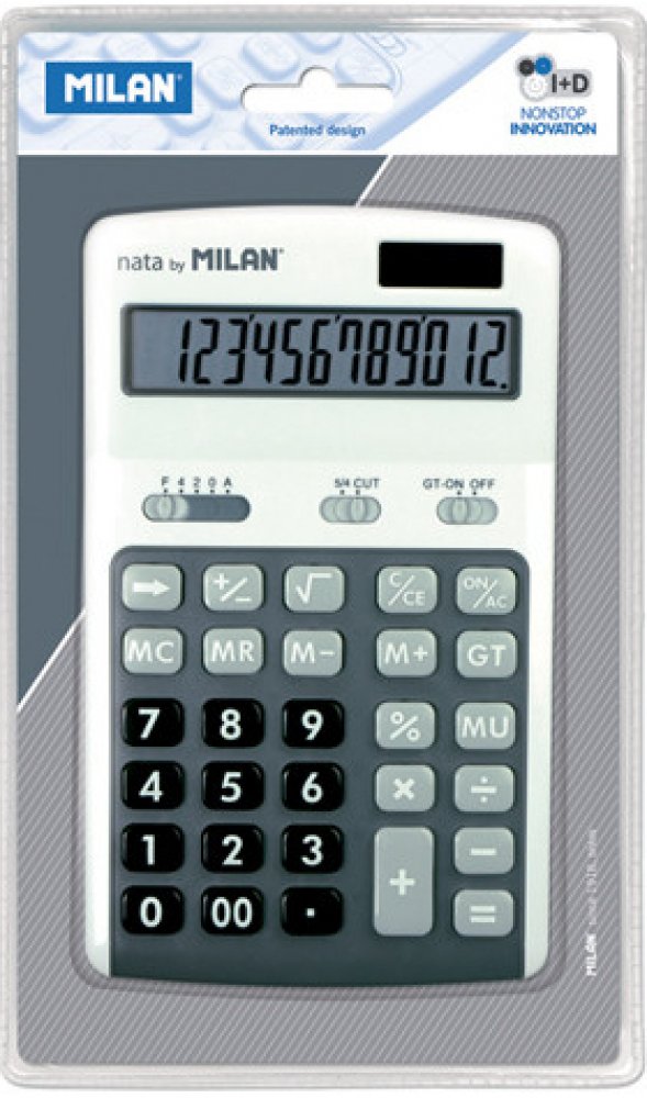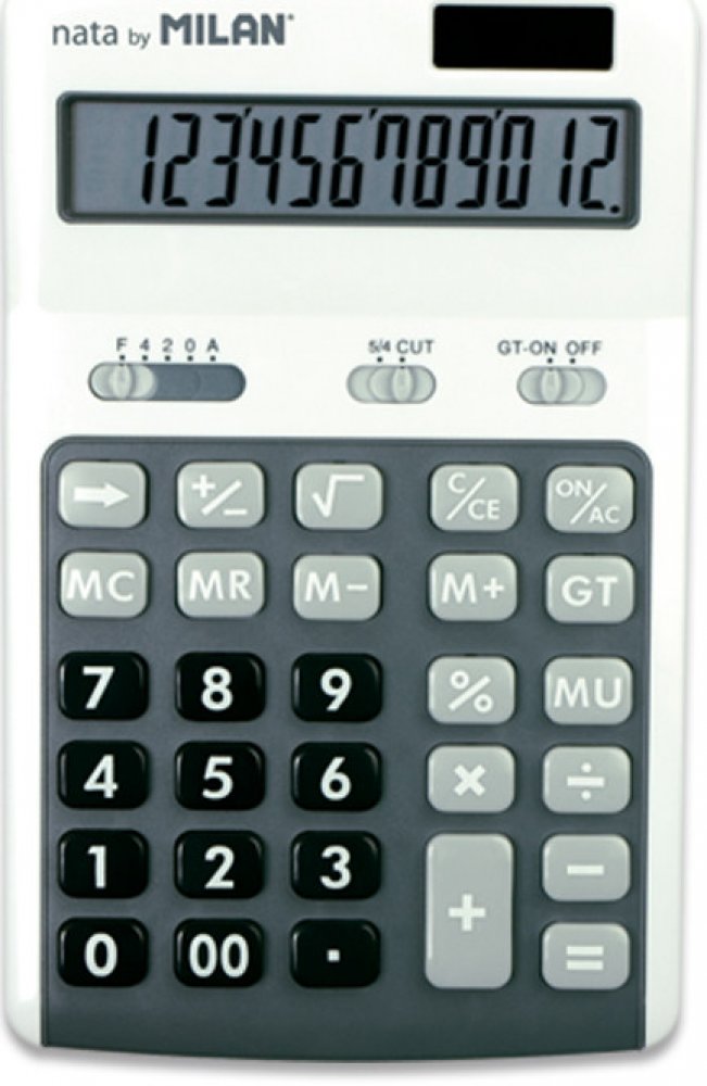 Stolová 12-miestna kalkulačka MILAN s plastovými tlačidlami. Kalkulačka má kumulovanú pamäť pre výsledky operácií. Funkcie: výpočet percent, odmocniny, zmena zaokrúhľovania, opravné tlačidlo, automatické vypnutie. Kalkulačka má duálne napájanie: solárny článok a 1,5 V batérie. V bielo-sivom prevedení.