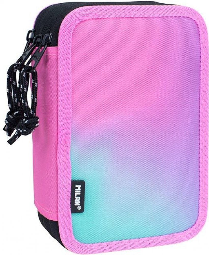 Třípatrový penál, který vám umožní mít školní potřeby vždy uklizené a snadno dostupné. Série Sunset, růžová barva. Kombinace přechodových barev inspirovaných západem slunce s černobílými detaily. Stahovák zipu se šňůrkou. Včetně školních potřeb: 2 gumy (4024 a růžová nata® 320 Sunset), 1 ořezávátko AFILA, 1 grafitová tužka HB, 3 pera CAPSULE (zelená, černá a červená), 1 trojúhelníkové pravítko 15 cm, 12 trojúhelníkových barevných tužek, 6 černých dřevěné kovové barevné tužky, 5 zvýrazňovačů,