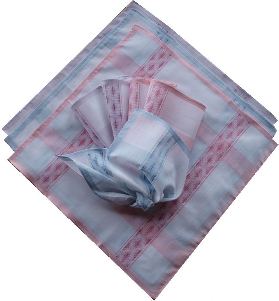 Dámské bavlněné kapesníky od českého výrobce. V sáčku je poskládáno šest kusů kapesníků, vždy po dvou barvách. Rozměr dámských kapesníků je cca 32x32 cm. Kapesníky jsou vyrobeny ze 100% česané bavlny. Jedná se o nejkvalitnější materiál používáný při výrobe kapesníků.