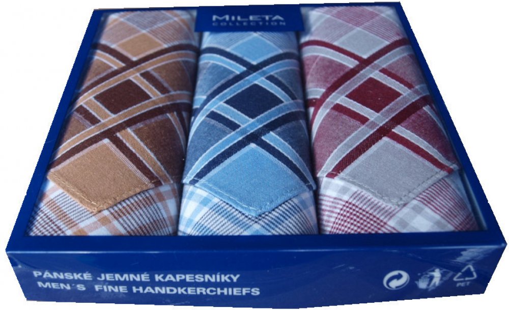 Pánské dárkové klasické bavlněné kapesníky jsou baleny v krabičce po třech kusech. Rozměr kapesníků je cca 40 cm x 40cm. Kapesníky jsou vyrobeny ze 100% bavlny. Samozřejmostí je česká tradiční výroba.