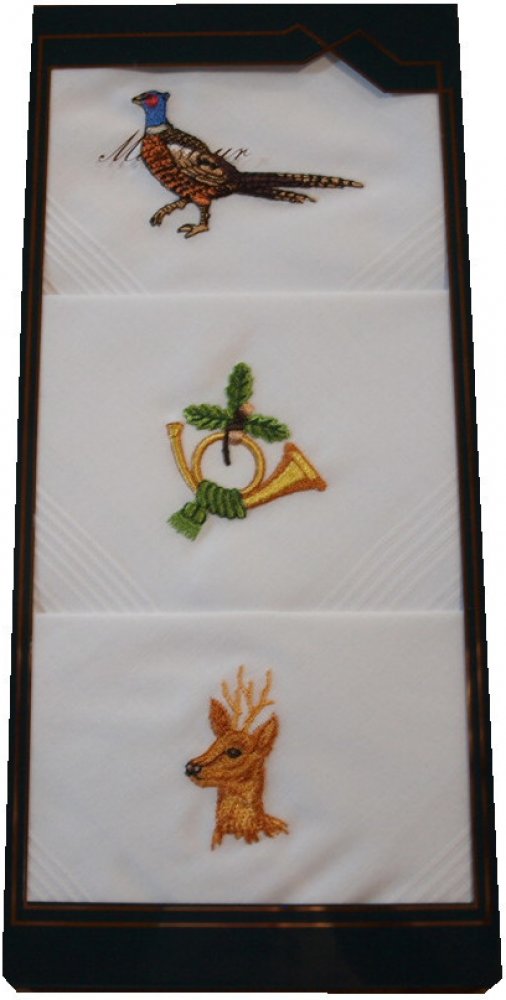 Kvalitní bavlněné kapesníky balené po třech kusech v krabičce. Kapesníky jsou vyrobeny z česané bavlny, rozměr kapesníků je klasický cca 40x40cm.